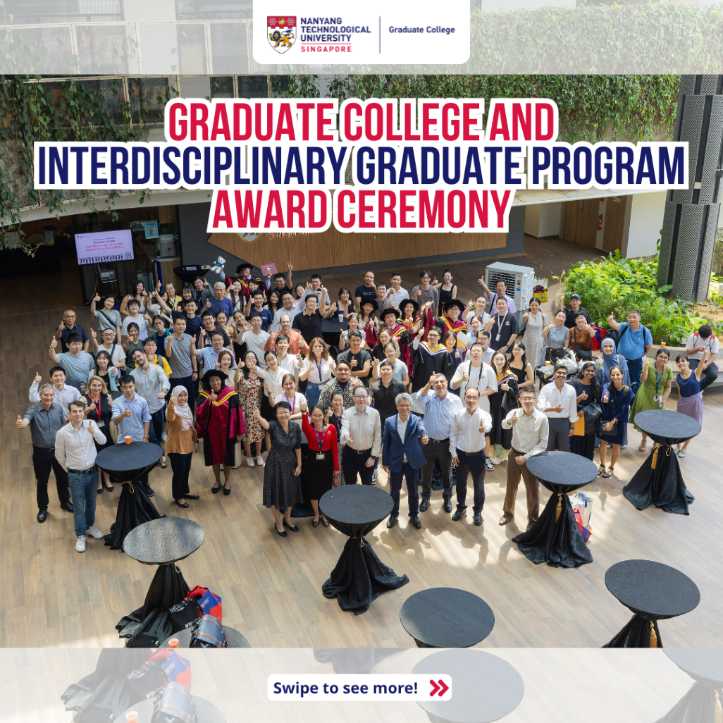 The Graduate College Awards aim to recognise and reward outstanding graduating PhD and Master by Research students for academic, collaborative, interdisciplinary and entrepreneurial achievements during their postgraduate studies in NTU. Supervisors are also recognised for their outstanding mentoring efforts of graduate students.