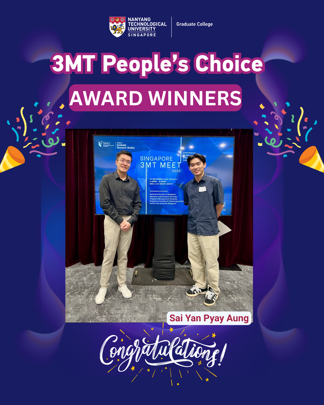 NTU students Wang Yuchen and Sai Yan Pyay Aung clinched two People’s Choice Awards at the Singapore 3MT Meet 2025