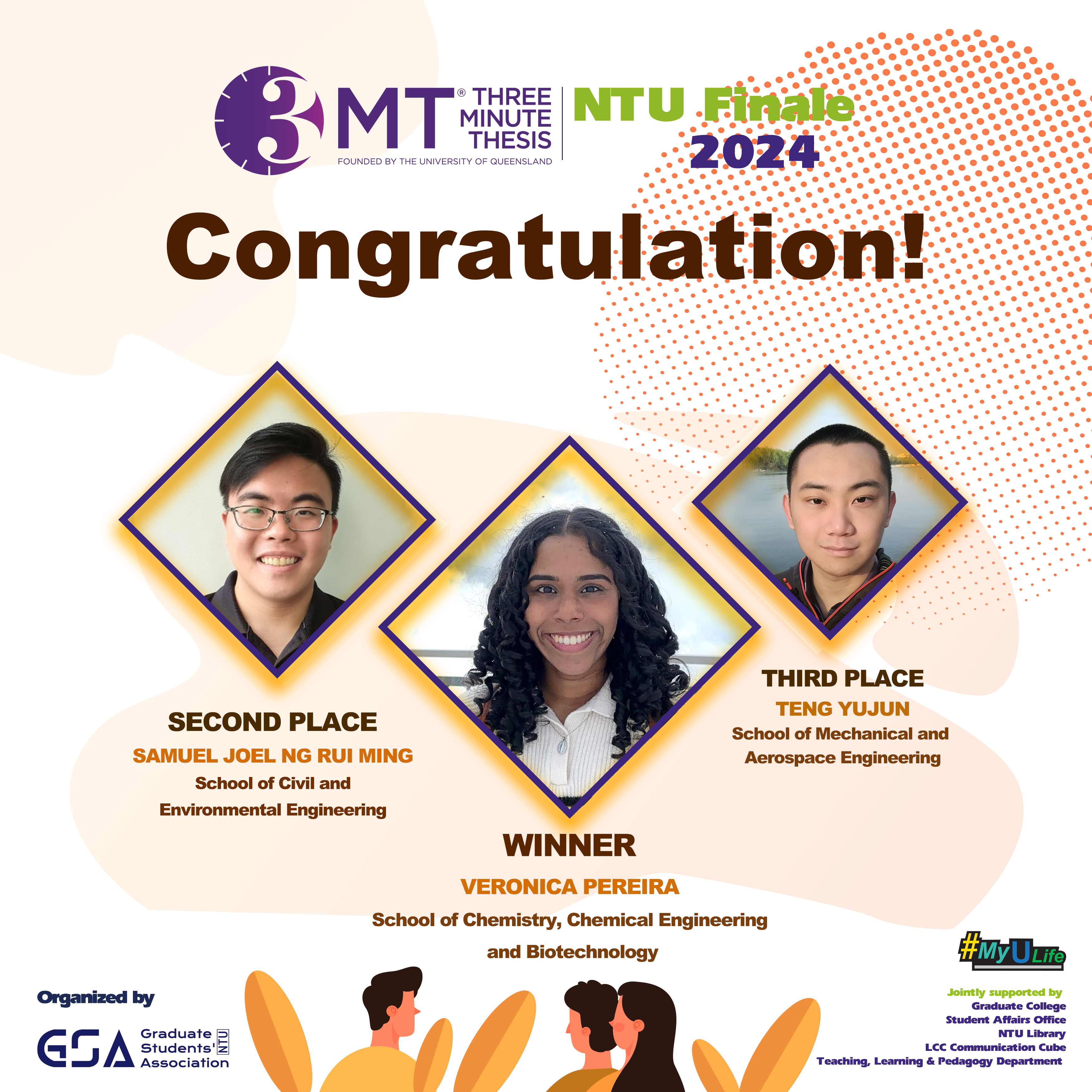 The 3MT (Three Minutes Thesis) Singapore Meet held on 13 Sept 2024 was hosted by NTU Graduate College and jointly supported by the Student Affairs Office and Graduate Students’ Association. The event highlighted incredible research from five universities mainly Nanyang Technological University, Singapore; National University of Singapore; Singapore Management University; Singapore University of Technology and Design and James Cook University, Singapore. A total of 15 captivating videos of top 3 winners from each university were presented. Our NTU Top 3 NTU Finalists’ representatives were: i) Veronica Pereira; ii) Samuel Joel Ng Rui Ming; iii) Teng Yujun.