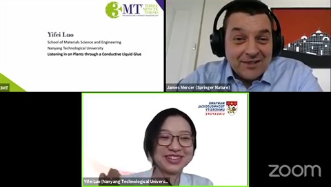 MSE PhD candidate, Ms Luo Yifei, has bested 7 other PhD students from universities in the region to win the 2020 Asia Pacific Three Minute Thesis (3MT) competition on Thursday, 1 October 2020. We have made history as the first Singapore University to win the Asia Pacific 3MT Finals since its inception in 2016. The virtual competition hosted by the University of Queensland challenges participants to explain their research thesis in a clear and engaging threeminute talk aimed at non-specialists. As the Asia Pacific 3MT winner, Yifei will receive a $5000 research grant, sponsored by Springer Nature. During the Q&A segment, Yifei was asked, “How many plants that she has at her place” as well as “What got her interested in her topic for 3MT”. To which Yifei replied, “I love nature and personally would normally care for 4 to 5 plants at one time. For this project, I have used hundreds of plants!” “The transformation of the thermogel in response to changing temperature and being able to read signals from plants are both intriguing and fun,” Yifei continued. The other Asia Pacific 3MT Finals participants were: Anna Frouws – Edith Cowan University (Runner Up - $2000 research grant, sponsored by Springer Nature) Stefania Peracchi – University of Wollongong (People’s Choice Award - $1000 research grant, sponsored by UniBank) Kylie Sturgess – Murdoch University Rocco Cavaleri – Western Sydney University Theresa Pankhurst – Victoria University of Wellington Jessica Bolin – University of the Sunshine Coast Megan Burfoot – Auckland University of Technology In her talk entitled ‘Listening in on Plants through a Conductive Liquid Glue’, Yifei shared that plants can feel pain and heat just like us. They give out certain types of electrical signals that tells us how healthy a plant is. This affects the price and quality of the plant to goes on our plate. When asked how she felt after winning the Asia Pacific 3MT Finals, Yifei replied with thrilled, “I'm so proud of myself and NTU. I couldn't believe I am the winner !!” Her advise for fellow students who may hesitate to participate in 3MT in future? “Just go for it. You will not lose anything even if you don’t win. Plus, you will definitely learn something”, quips Yifei. Yifei took the opportunity to thank Dr. Ai Lin Chun for her guidance in crafting Yifei’s script. She is grateful to the Teaching, Learning and Pedagogy Division (TLPD) trainers and her peers during the 3MT workshop for their feedback and suggestions. She also thanked her supervisor, Prof Chen Xiaodong, for his full support during the competition, and of course the NTU’s 3MT organizers, NTU GSA, in collaboration with SAO and Graduate College, for a fantastic job in organizing this year’s event. Congratulations, Yifei, on making NTU proud!