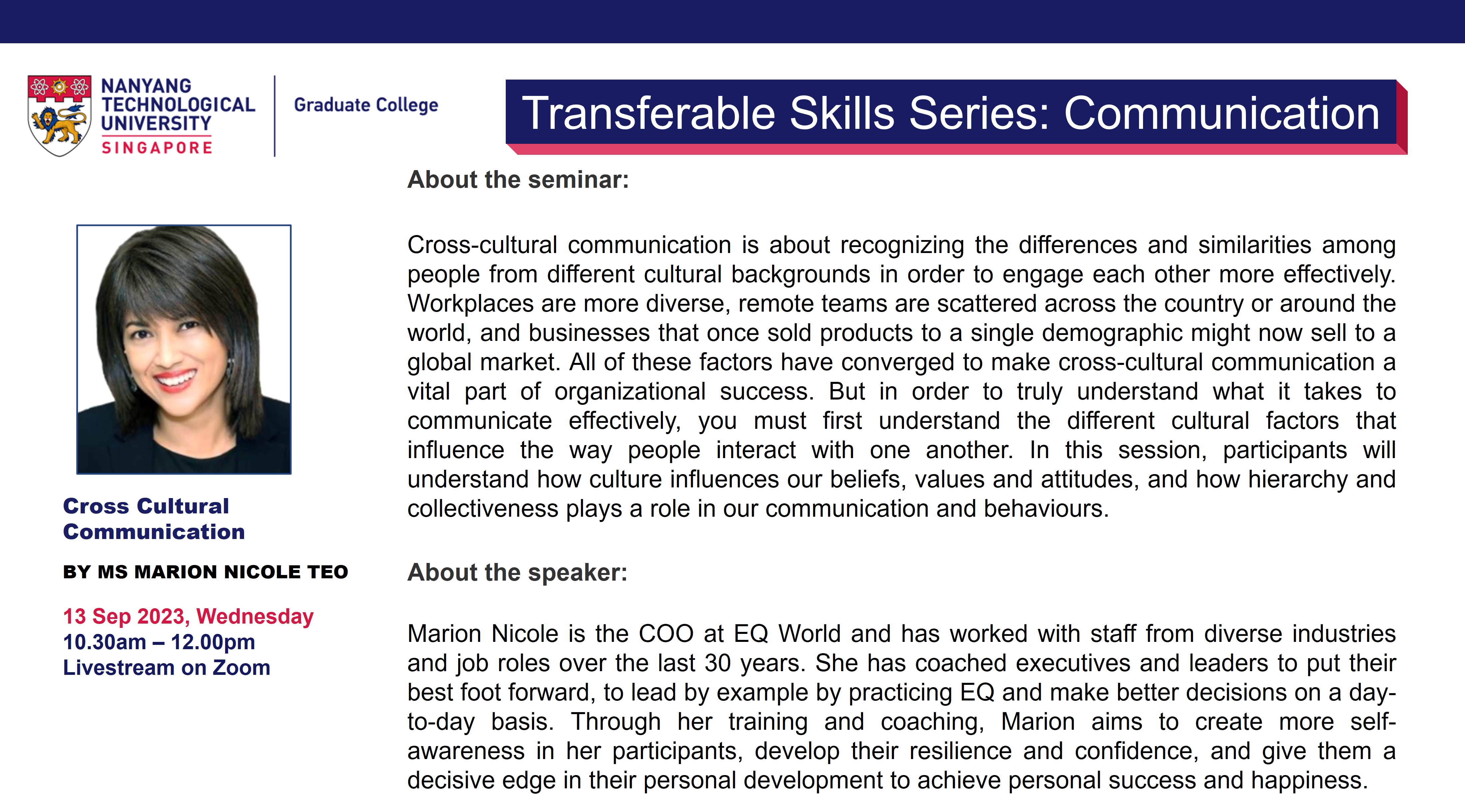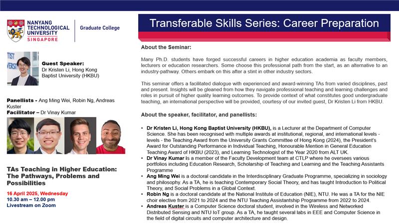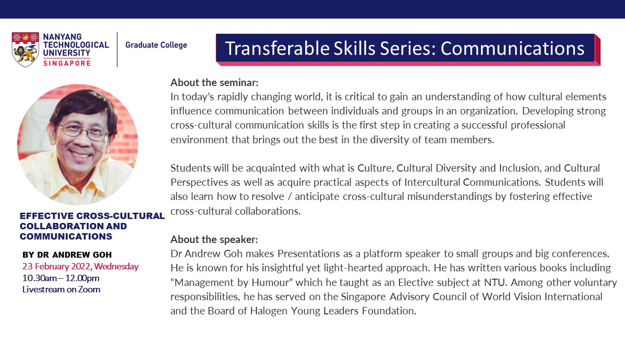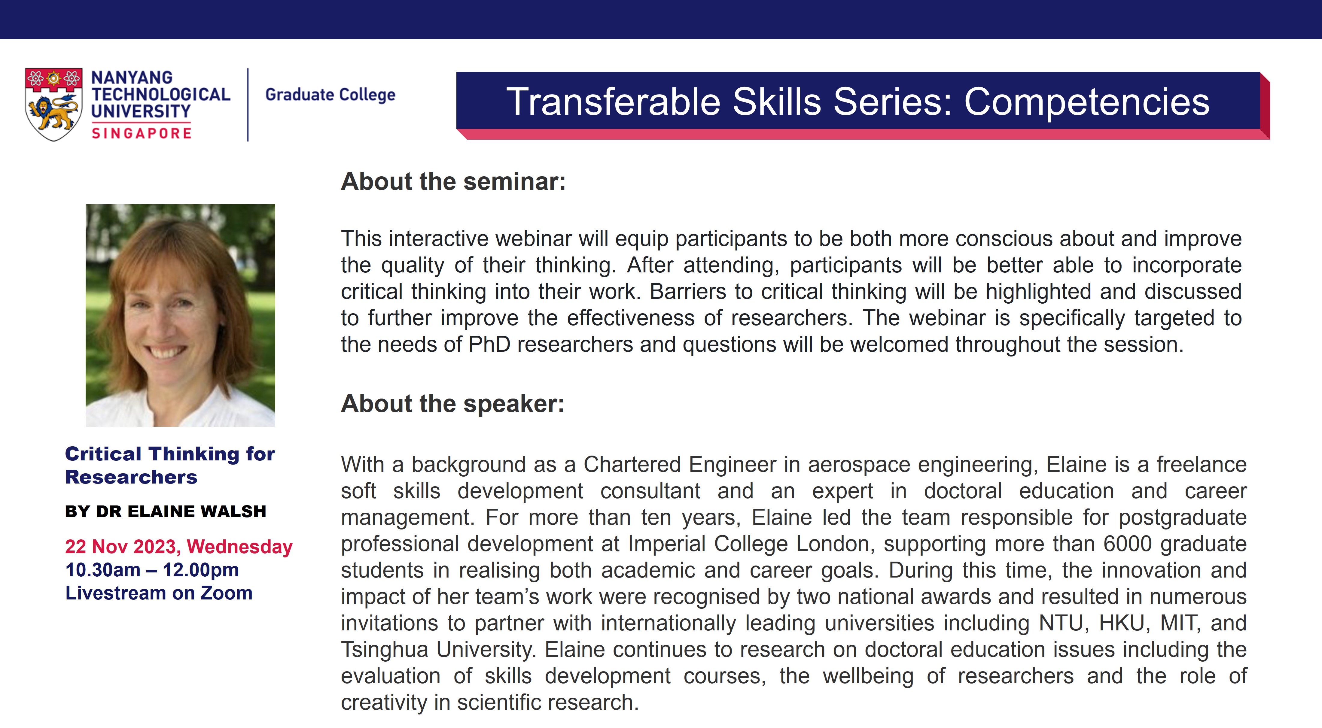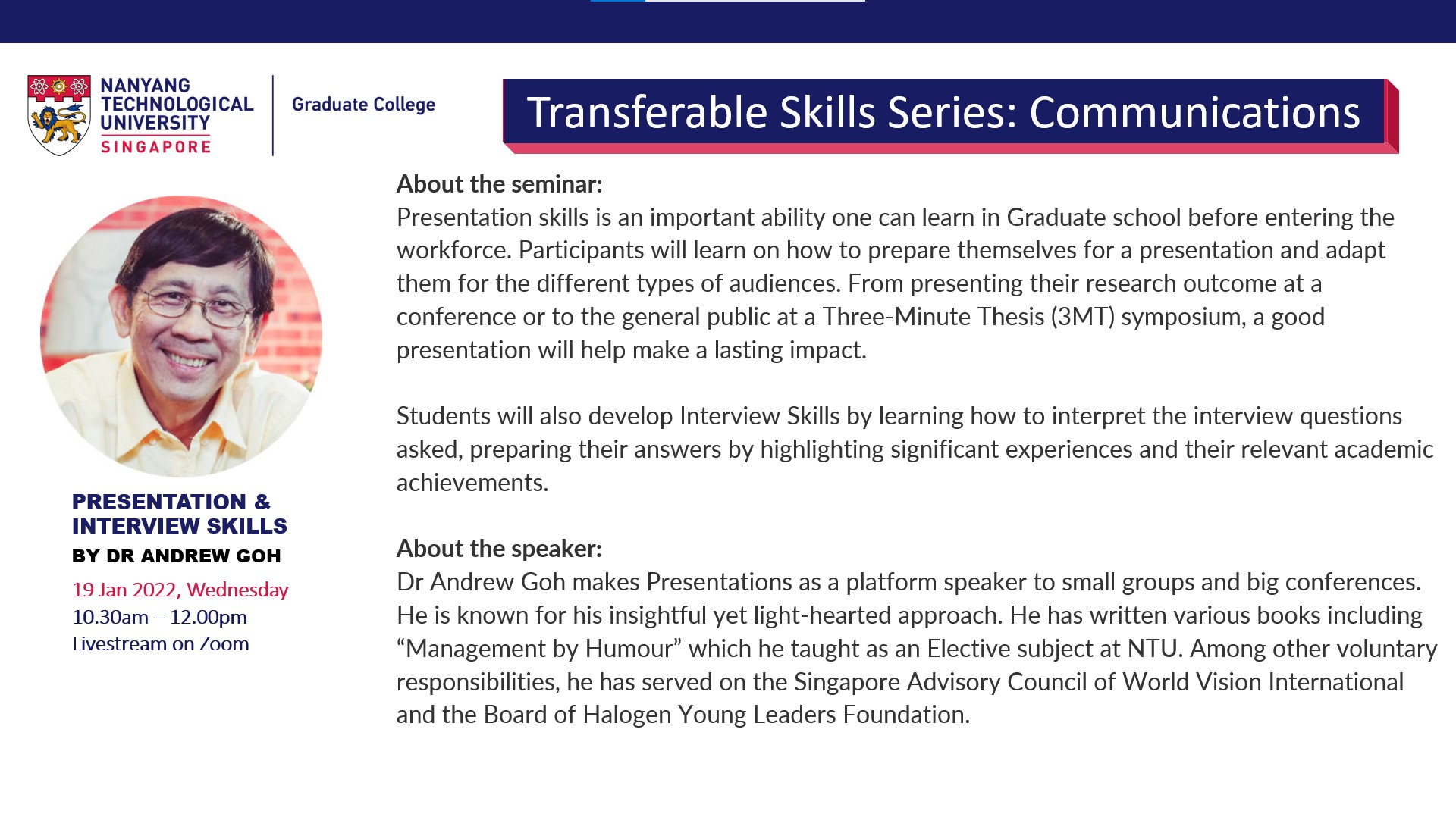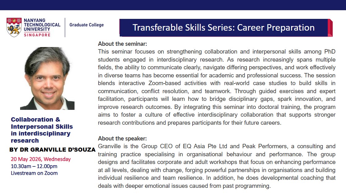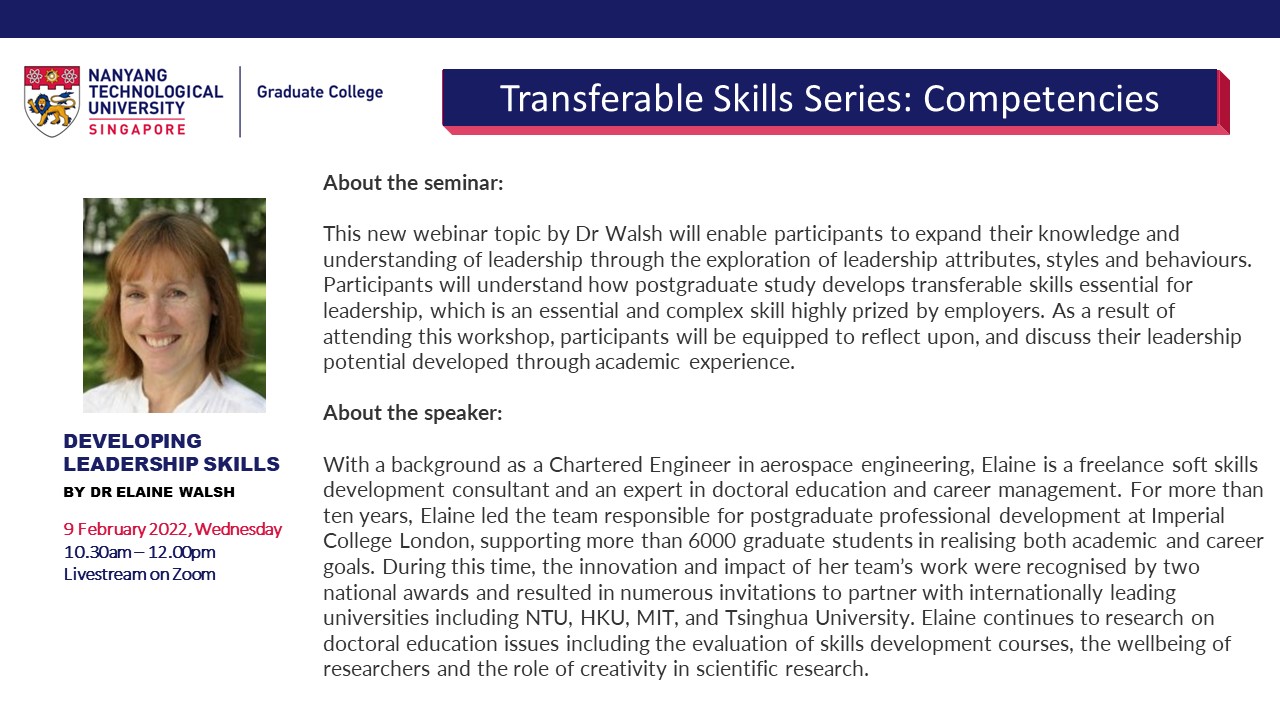 The Graduate College Transferable Skills Series (TSS) aims to impart soft skills that are relevant to both research and career preparation in all domains. The weekly 90-minute (Wed,10.30am-12pm) webinars are based around themes: Career Preparation; Communication; Wellbeing; Competencies.