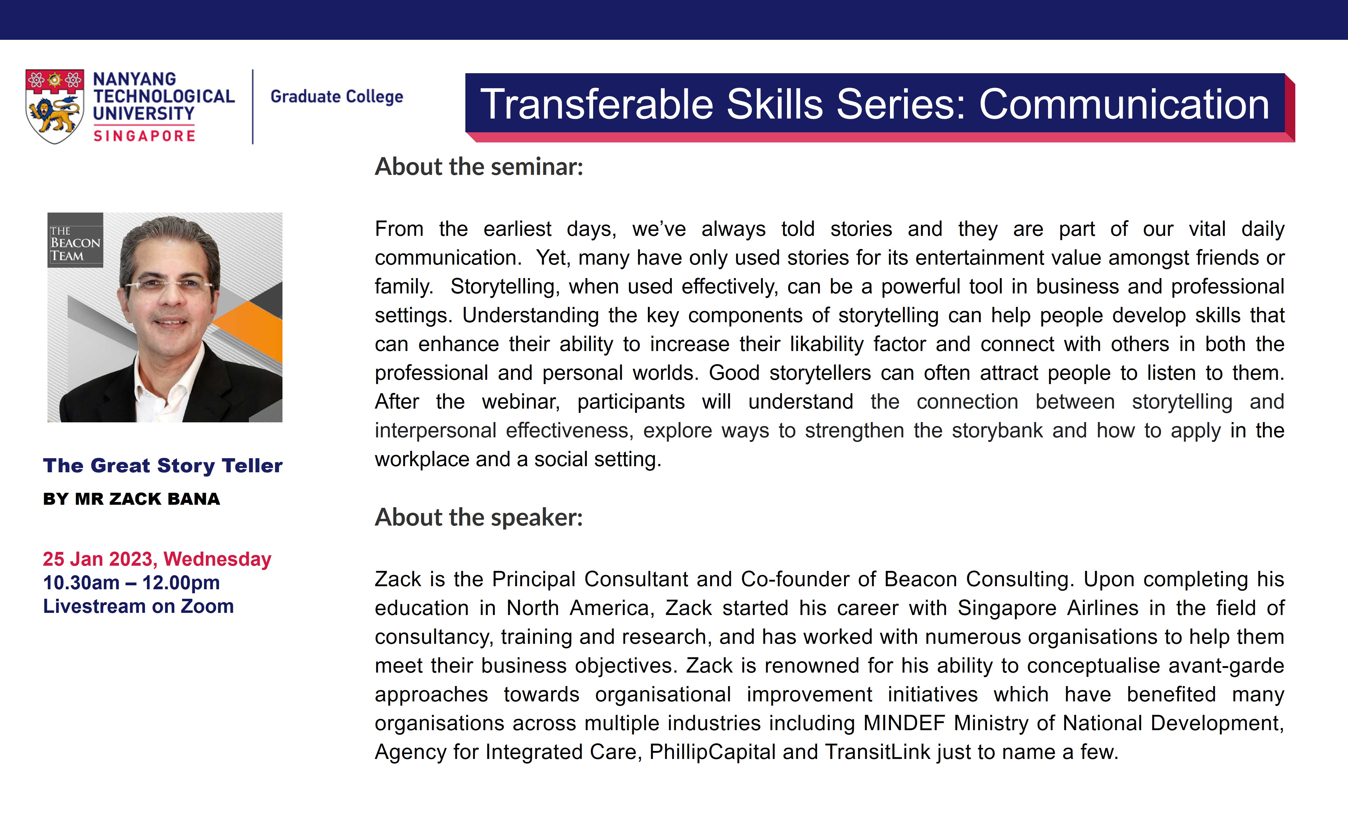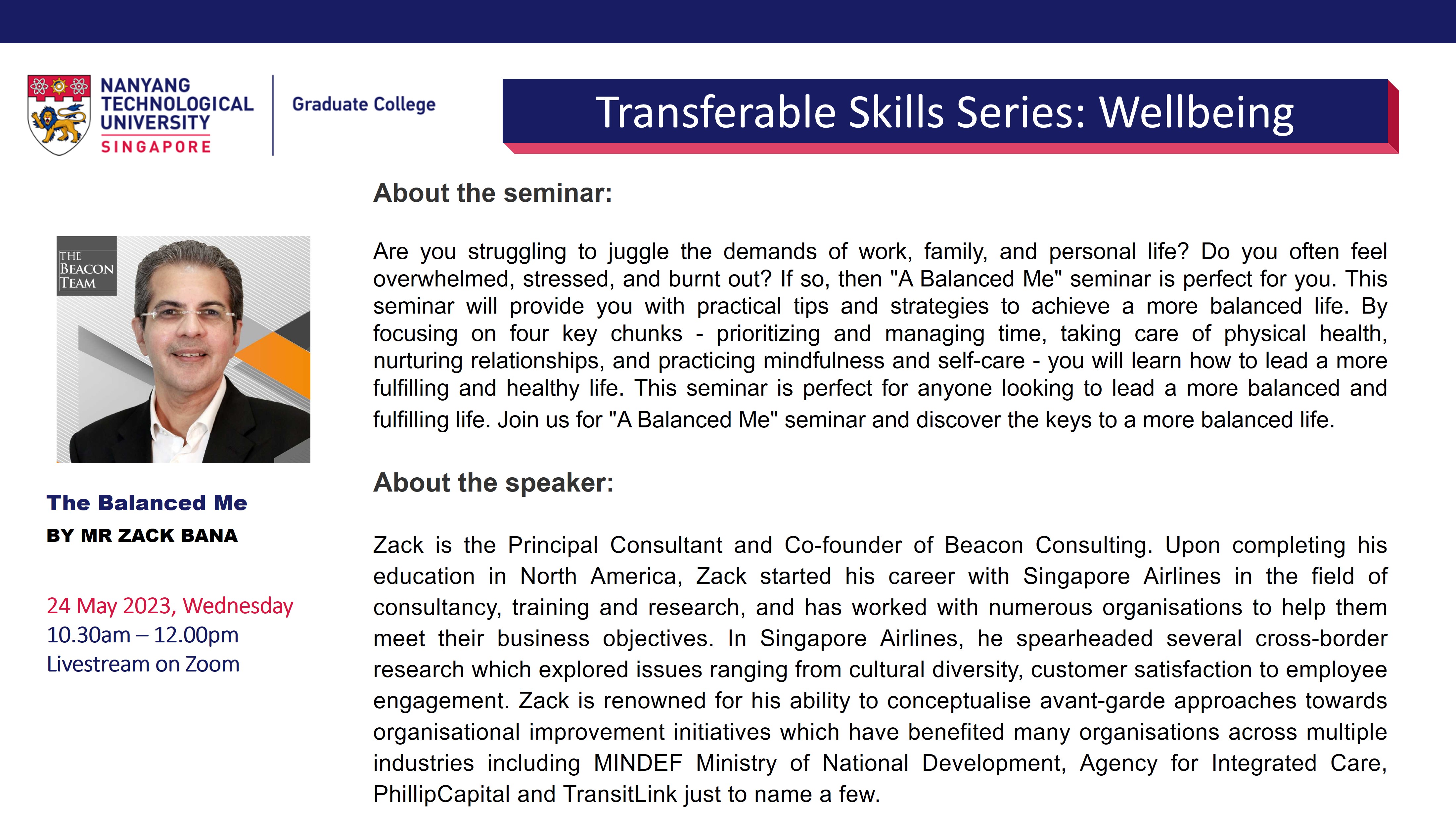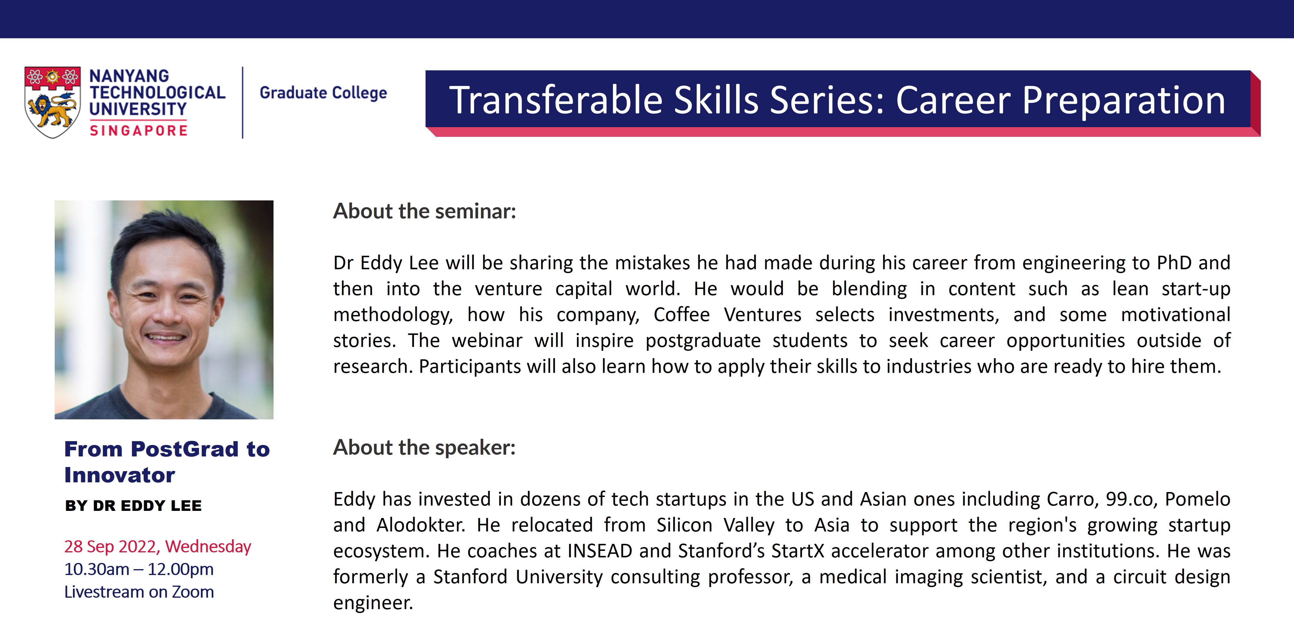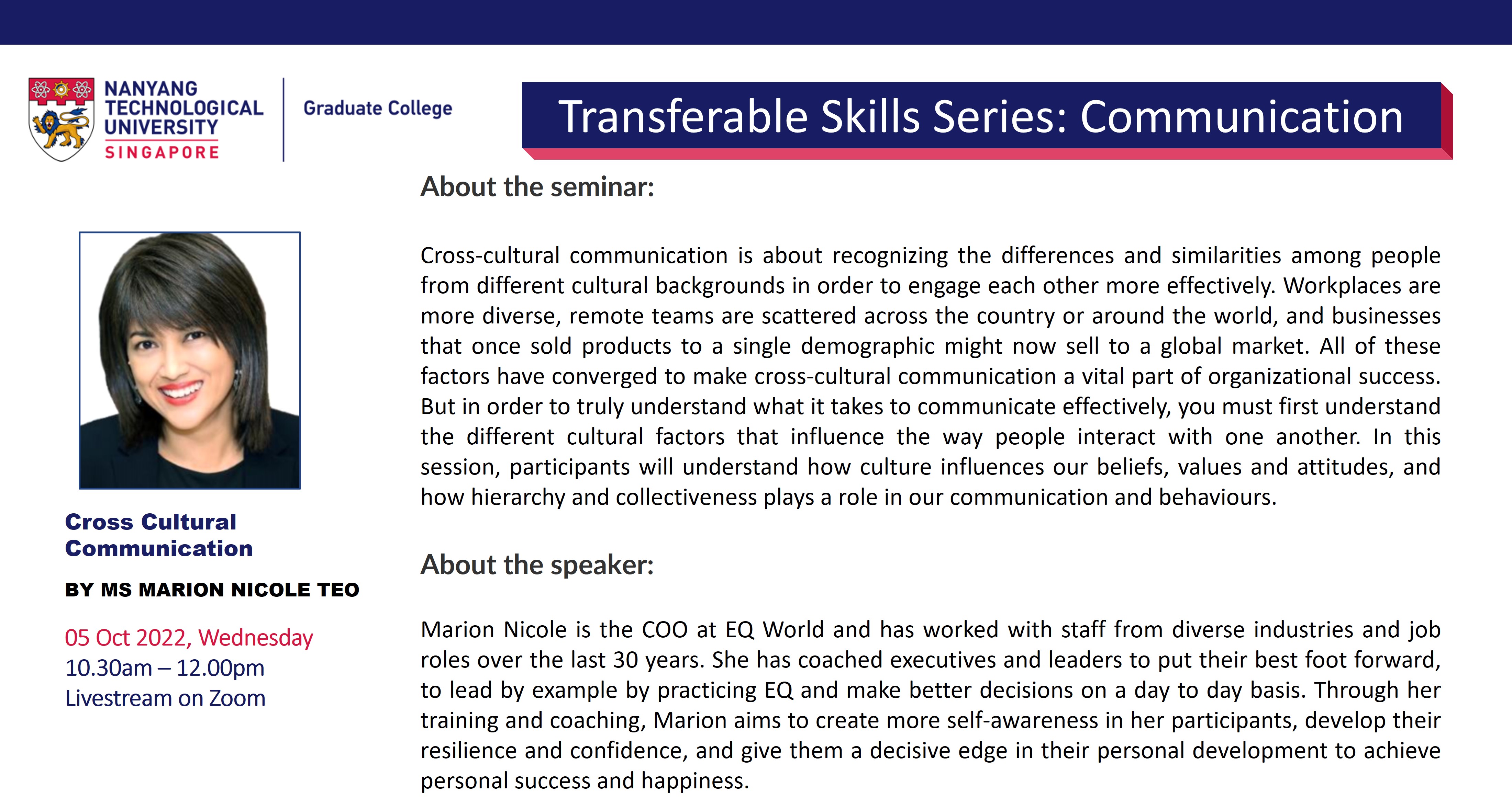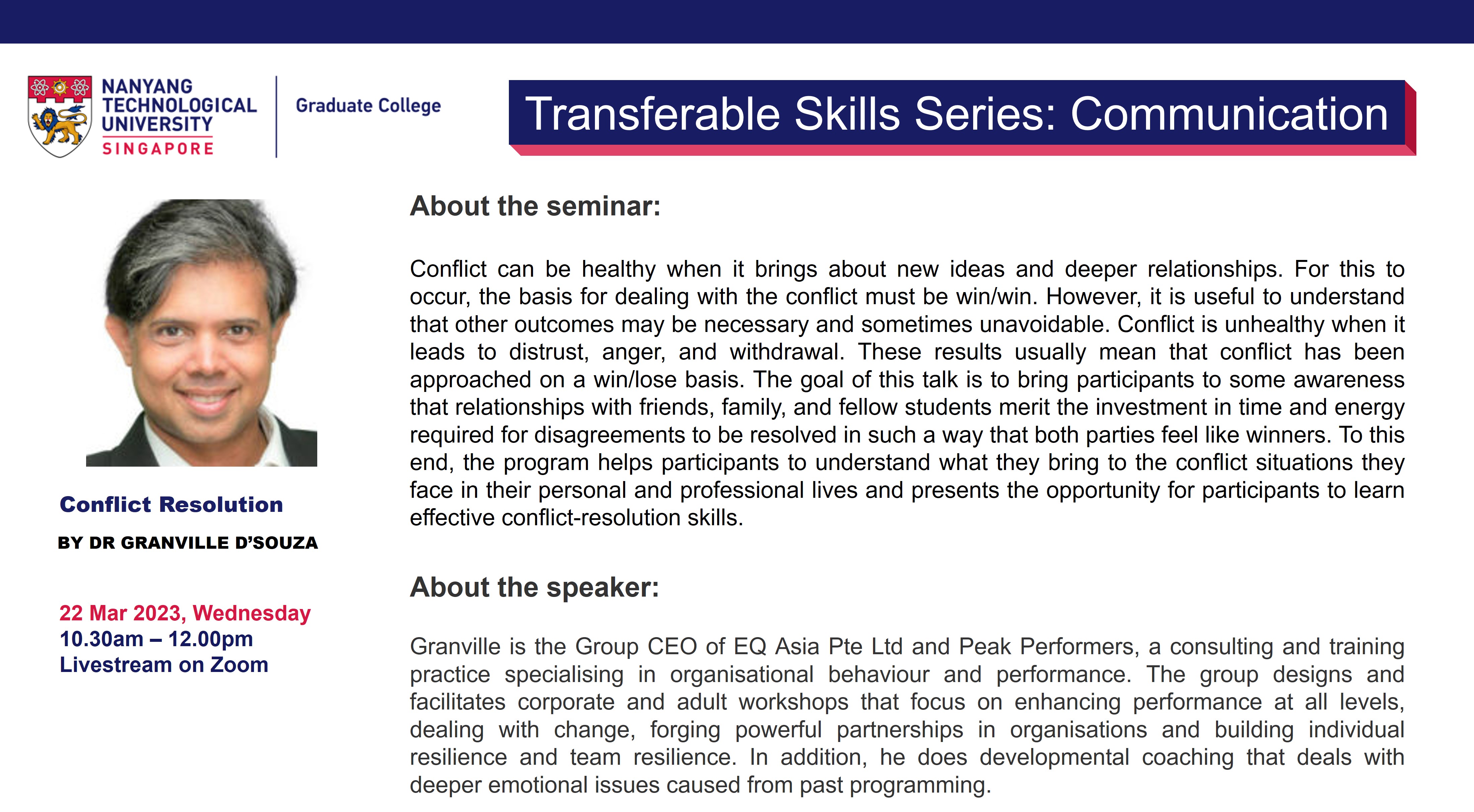 The Graduate College Transferable Skills Series (TSS) aims to impart soft skills that are relevant to both research and career preparation in all domains. The weekly 90-minute (Wed,10.30am-12pm) webinars are based around themes: Career Preparation; Communication; Wellbeing; Competencies.