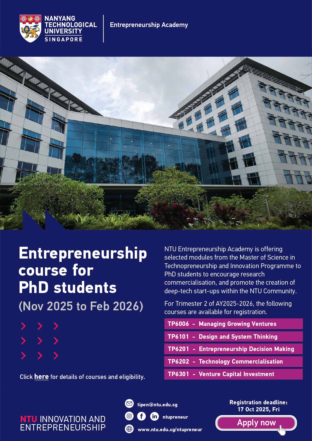 Graduate College would like to share the following Entrepreneurship electives (in MScTIP) complimentary available for all PhD students for Trimester 2 AY2023-2024.