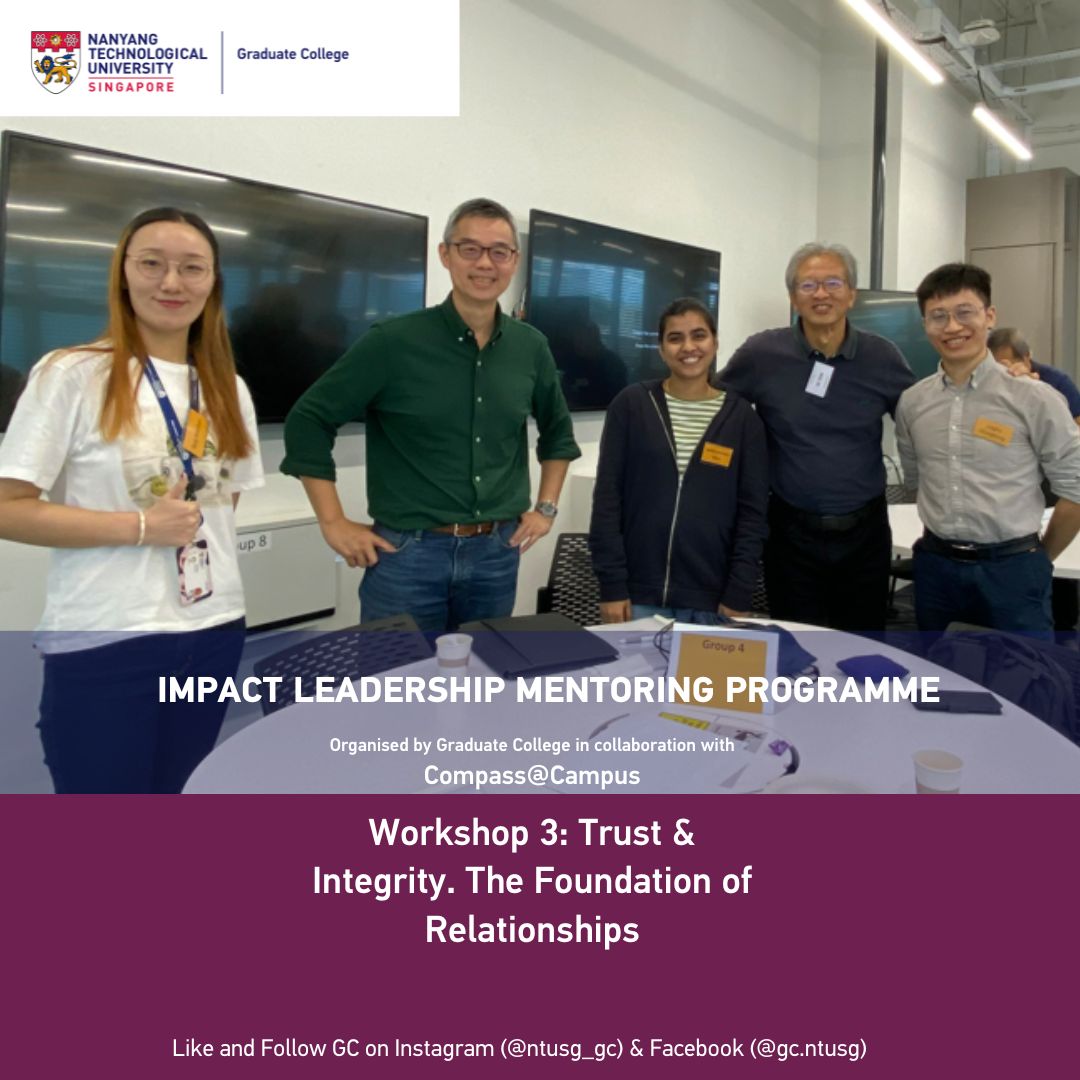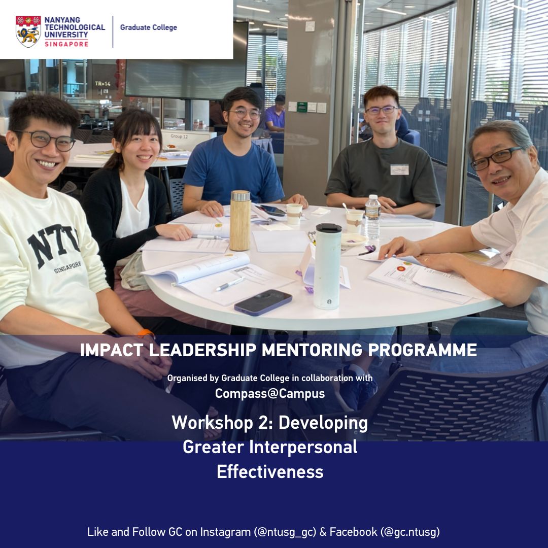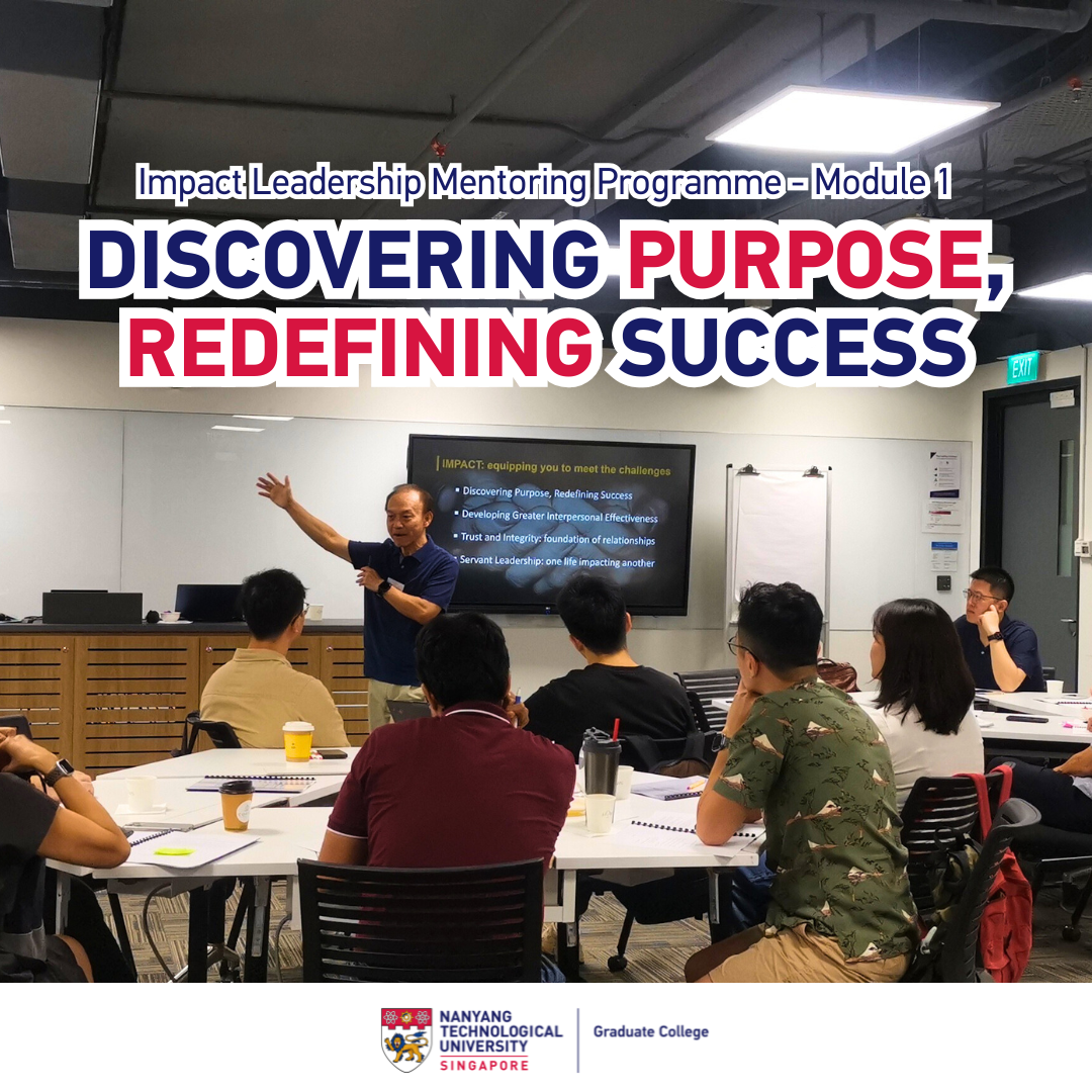 The Impact Leadership Mentoring Programme, organised by NTU Graduate College in collaboration with Compass@Campus, is a four-module programme that aims to help participants discover their purpose, redefine success, develop greater interpersonal effectiveness, understand the importance of trust and integrity in relationships, and learn about servant leadership. The programme was conducted over four Saturdays between 18 February and 11 March 2023 at The Arc, LHN-TR+15, and required a commitment from students to attend all four modules in person.