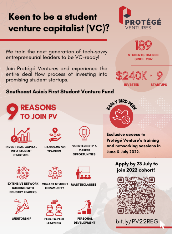 Protégé Ventures, Southeast Asia’s first student-run venture fund, trains highly motivated students to be tech-savvy entrepreneurial leaders by equipping them with skills and the mindset to navigate the world of venture capital and get a career head start as a venture capitalist. The national programme is open to all institutes of higher learning in Singapore.