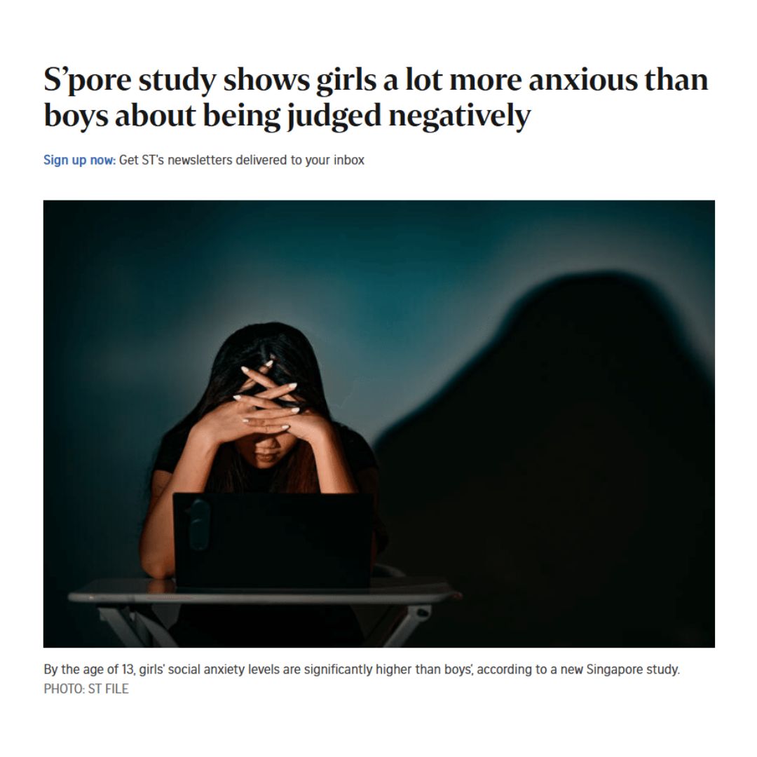 Read MoreS’pore study shows girls a lot more anxious than boys about being judged negatively