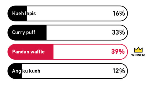 It was a wafer-thin win! Just 6% more NTU foodies chose pandan waffles – a comforting midday snack for many students – over the humble curry puff.