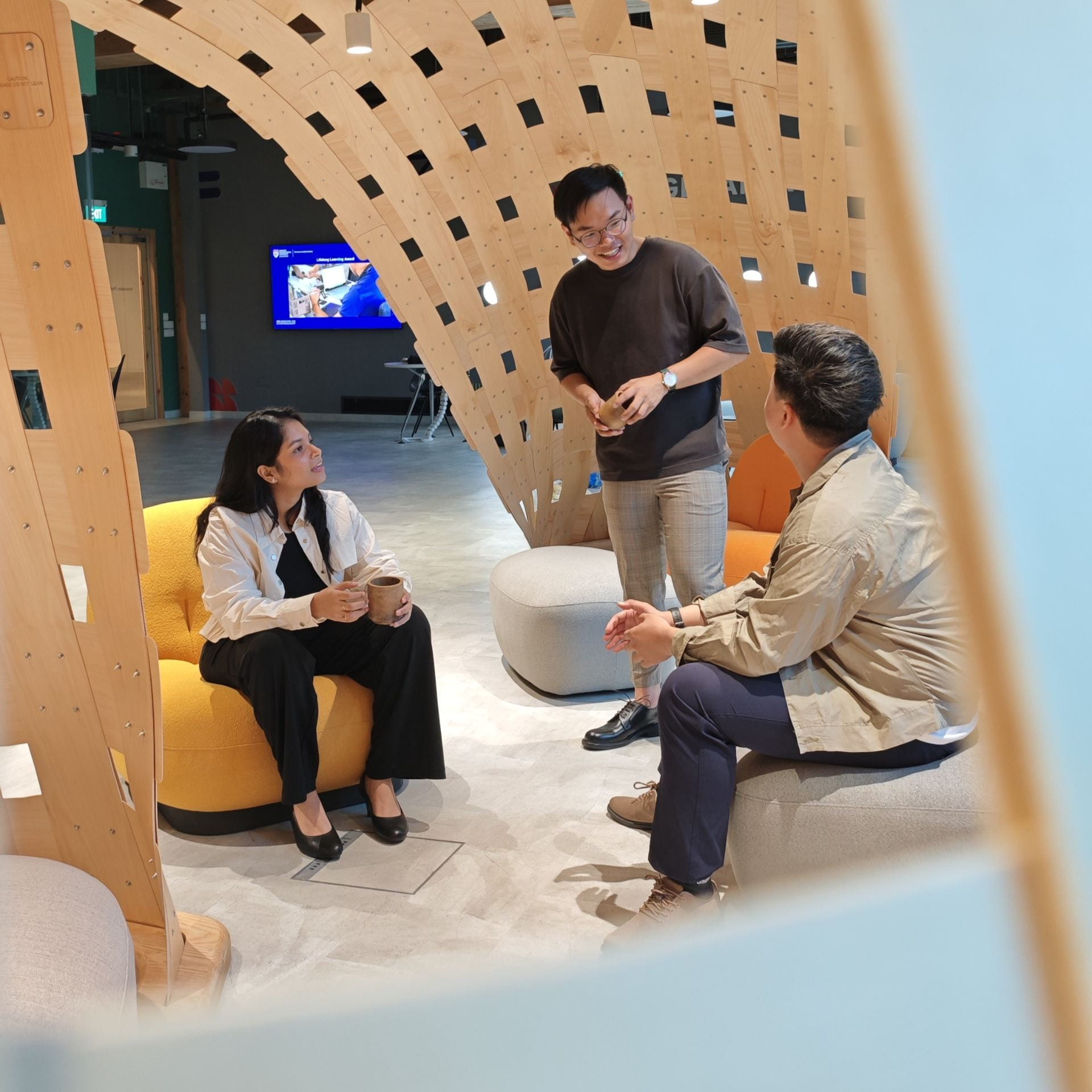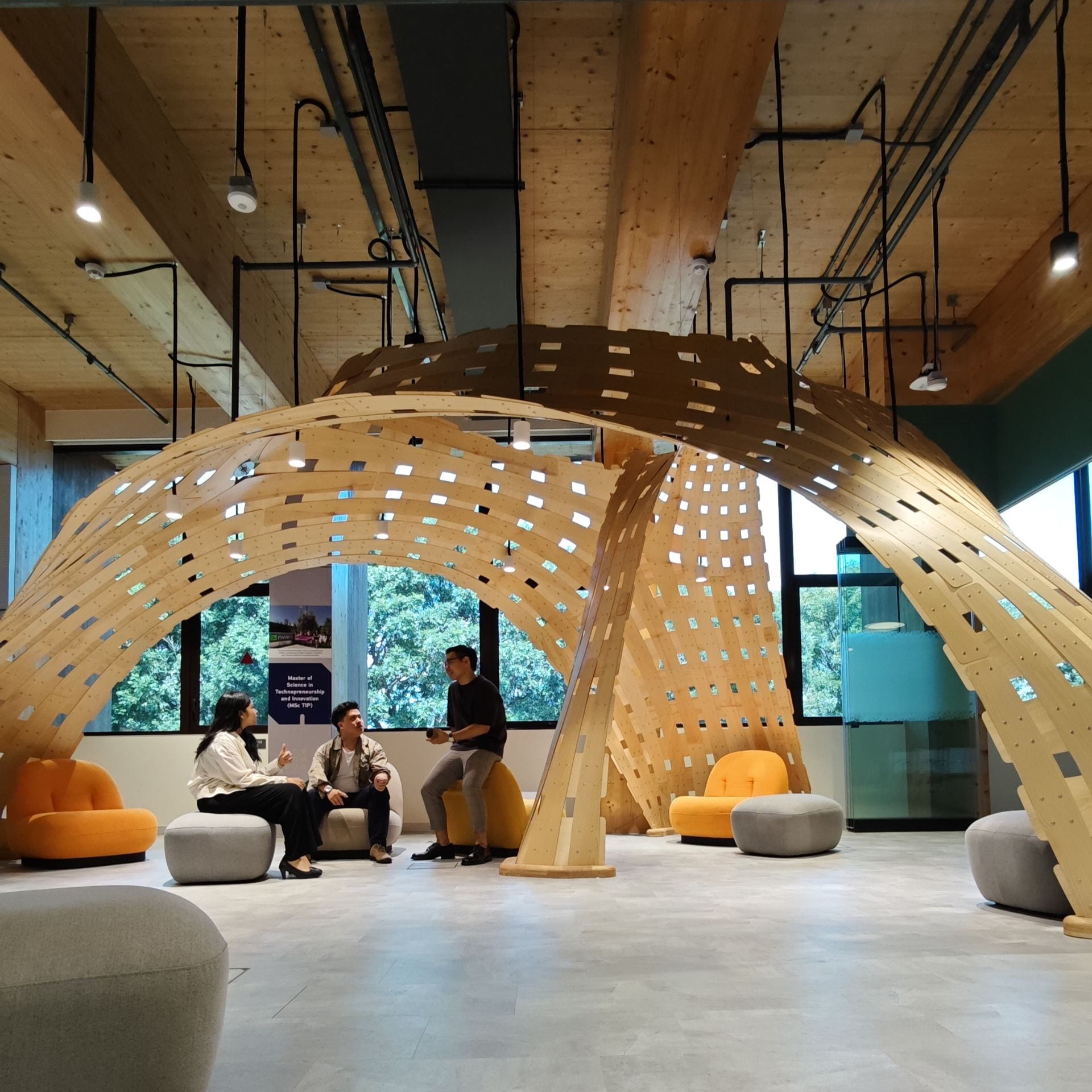 “We imagined it as a chill spot for students to gather and brainstorm novel business ideas. Since March, our team has been part of every design decision: we voted on the calming colours and picked out the comfy couches and this unique structure,” says business student Crystal Yap.