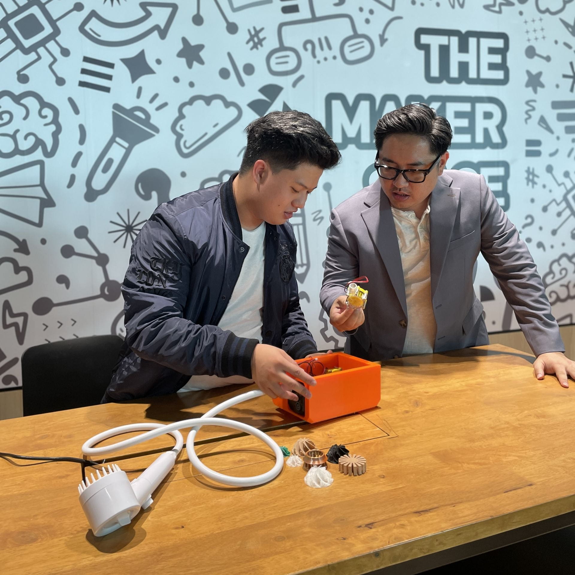 Ian (left) is finetuning his water heater prototype with support from lead technologist Lim Shengen at The Makerspace.