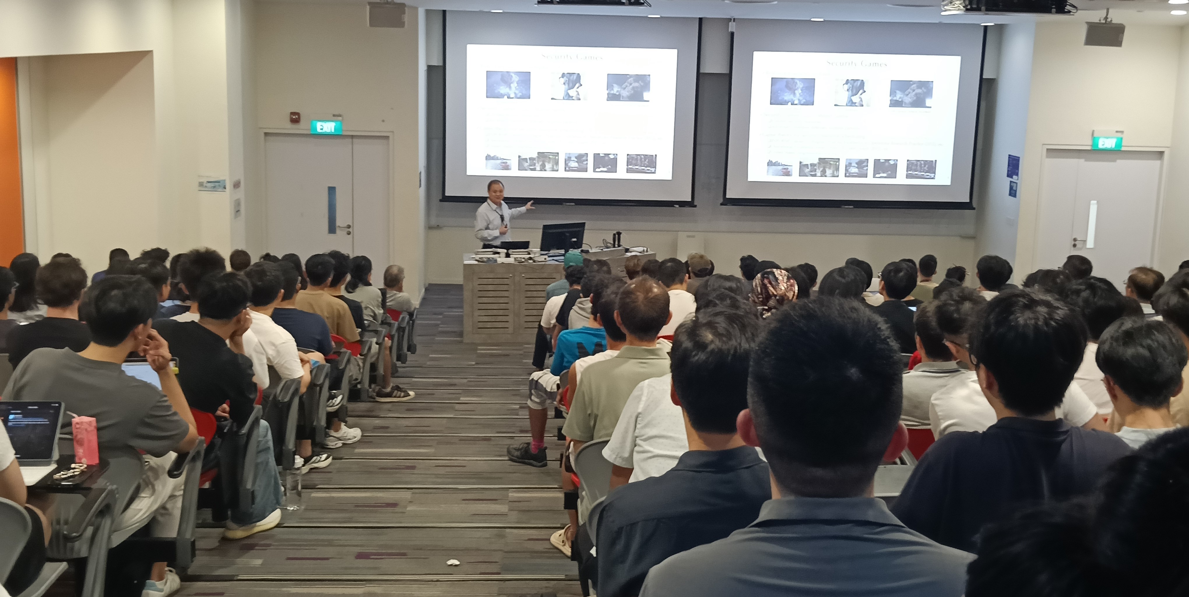 Transitioning to applied research, Prof An revisited the evolution of security games and pursuer–evader games (PEGs), which were developed to improve strategic decision-making in response to the heightened security challenges that followed the 9/11 terrorist attacks on the World Trade Center in New York back in 2001. These frameworks model adversarial interactions in real-world security contexts, such as optimizing patrol routes on a map of Singapore to intercept evasive targets. His team’s Deep RL-based PEG models such as NSGZero, extended these principles by enabling scalable, adaptive behaviour in highly complex environments. Such systems, he noted, demonstrate how reinforcement learning can transform theoretical game dynamics into deployable decision-support tools for large-scale security and resource allocation challenges.