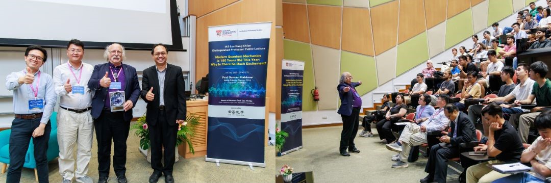 [Left] Assoc Prof Justin Song (SPMS), Prof Gao Weibo (Chair, EEE), Prof Duncan Haldane, and Prof Sum Tze Chien (Director, IAS); [Right] An insightful presentation by Prof Duncan Haldane on the excitement of modern quantum mechanics to a packed lecture theatre.