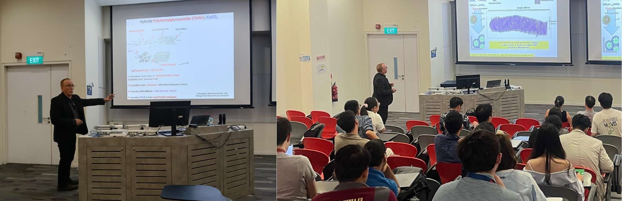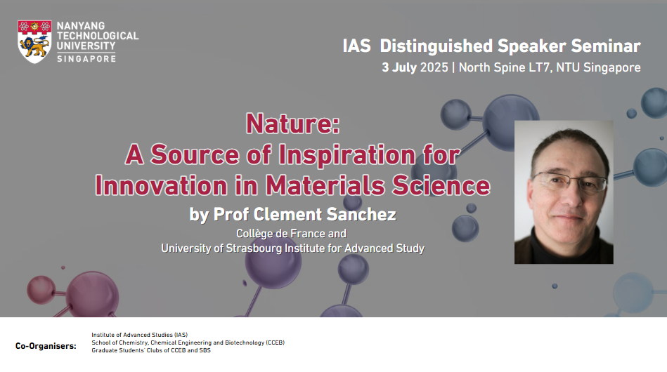 The Institute of Advanced Studies (IAS) at Nanyang Technological University, in collaboration with the Graduate Students' Clubs of CCEB and SBS, recently hosted an insightful colloquium by Prof Clément Sanchez from Collège de France and the University of Strasbourg Institute for Advanced Study. Prof Sanchez shared pioneering research in his lecture titled "Nature: A Source of Inspiration for Innovation in Materials Science" showcasing nature-inspired approaches to developing advanced materials and technologies.