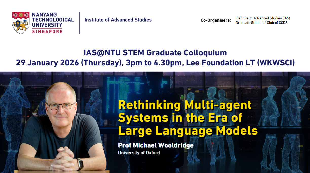 On 29 January 2026, the IAS@NTU STEM Graduate Colloquium hosted a compelling colloquium by Prof Michael Wooldridge (University of Oxford). In his talk titled “Rethinking Multi-Agent Systems in the Era of Large Language Models”, Prof Wooldridge examined how long-standing ideas in multi-agent systems (MAS) connect to today’s rapidly growing interest in LLM-based agents, and what challenges become more pressing when many agents interact and act on behalf of users.