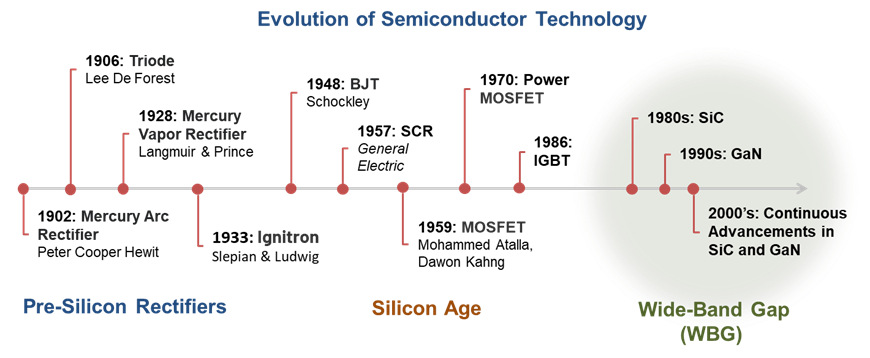 The evolution of semiconductor technology, from early rectifiers to modern wide-bandgap (WBG) devices, has transformed the landscape of power electronics. Figure 1 illustrates the historical trajectory—from mercury arc rectifiers and triodes in the early 1900s to the development of bipolar junction transistors (BJTs), MOSFETs, and the revolutionary Insulated Gate Bipolar Transistor (IGBT) in 1986. This progression ushered in the Silicon Age, which was later followed by the Wide-Bandgap era, marked by the emergence of SiC and GaN devices in the 1980s and 1990s. These materials, building on Baliga’s figure of merit, enable higher power density, lower conduction losses, and superior thermal performance—extending the legacy of efficient power conversion pioneered by Prof Baliga’s invention.