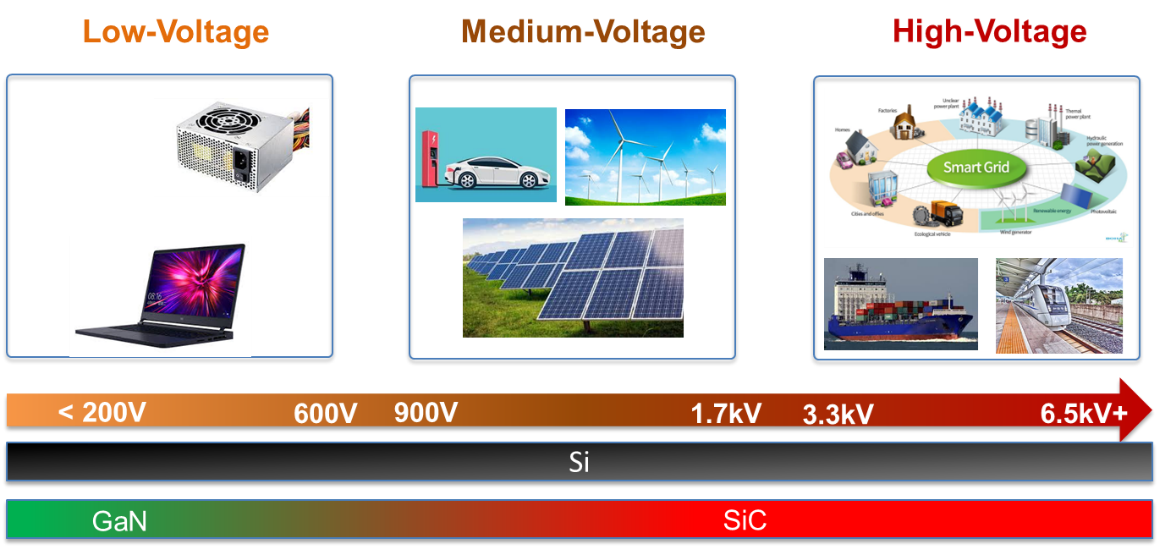 The scope of power electronics spans from low-voltage consumer electronics to high-voltage renewable energy and transportation systems. Figure 2 presents the voltage domains and associated technologies—showing how GaN dominates low-voltage (<200 V) converters such as laptop adapters, SiC extends efficiency to medium-voltage drives and EV chargers, and Si remains prevalent in general-purpose power systems. High-voltage SiC-based converters now underpin smart grids, rail systems, and maritime propulsion, marking the convergence of material innovation with large-scale electrification.
