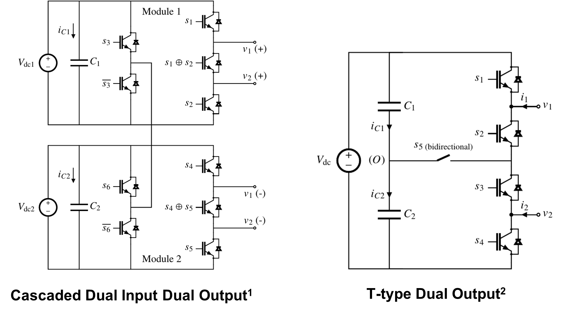Building upon these semiconductor advances, Assistant Prof Amer M. Y. M. Ghias and his researchers at NTU have developed several innovative converter topologies that expand Baliga’s principles of efficiency and scalability. These include the Cascaded Multi-Output Multilevel Converter, the Reduced Switch Count Dual-Output T-Type Multilevel Converter, and the Active Nested Neutral-Point-Clamped (NNPC) Converter. Each topology enhances modularity, reduces harmonic distortion, and enables flexible multi-port operation with improved fault tolerance. Representative schematics are shown in Figure 3.