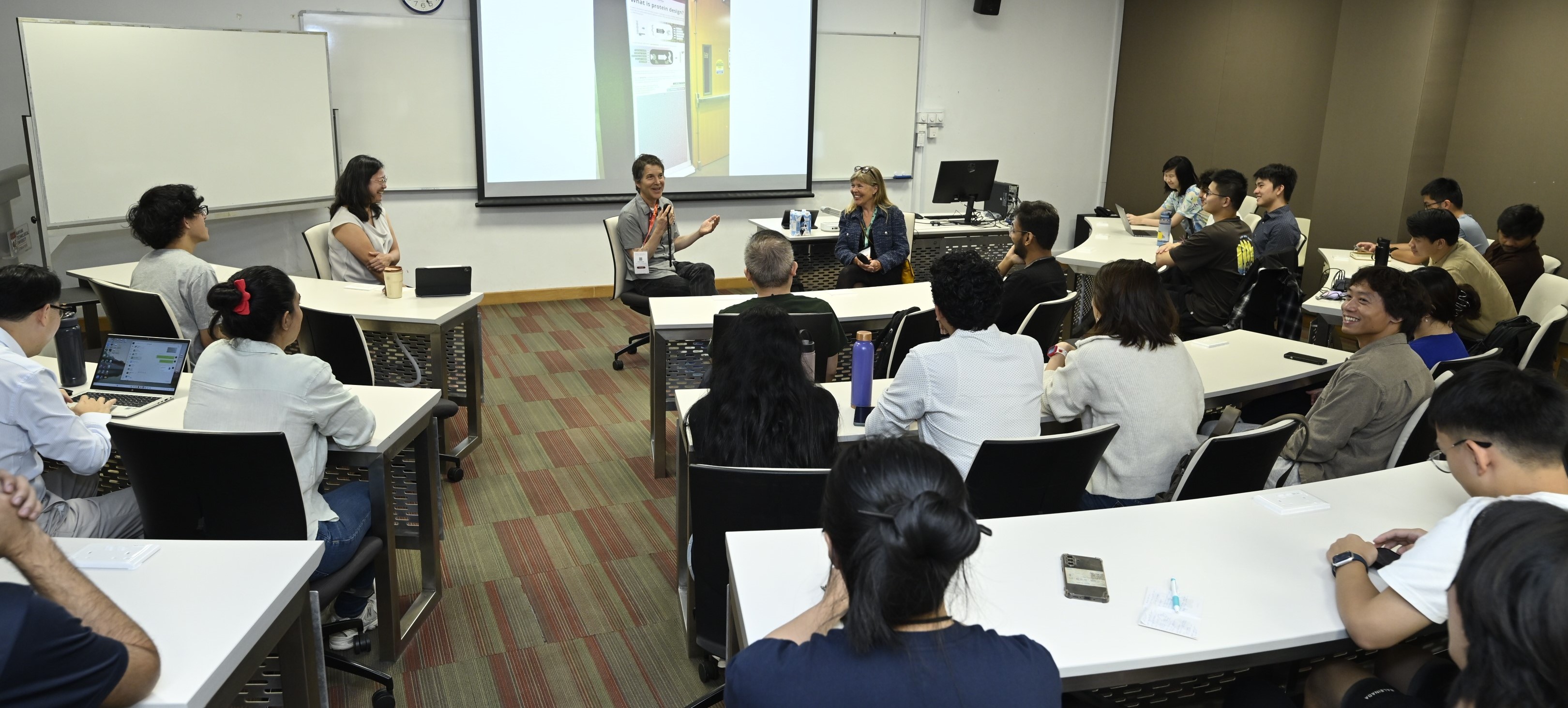 On 6 January 2026, prior to their highly anticipated Lee Kong Chian Distinguished Professor Public Lecture, the Institute of Advanced Studies (IAS) at Nanyang Technological University hosted a close-knitted tea session with Prof David Baker, Nobel Laureate in Chemistry (2024) for computational protein design, and Prof Hannele Ruohola-Baker (Co-Director, Institute of Stem Cell and Regenerative Medicine, University of Washington). The afternoon session with NTU scholars and PhD students became a fast‑paced tour of modern science in motion: careers that veered from philosophy to biology, deep learning reshaping decades of protein design, and purpose‑built proteins opening new paths in stem cell research and patient care. In a lively, candid exchange spanning computational sciences, biology and medicine, the conversation echoed Singapore’s and NTU’s ambitions for high‑impact innovation, inspiring PhD students and researchers to courageously pursue and push research frontiers.