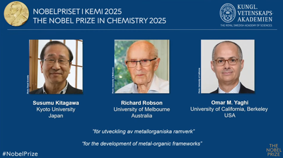 The 2025 Nobel Prize in Chemistry has been awarded to Prof Susumu Kitagawa (Kyoto University), Prof Richard Robson (University of Melbourne), and Prof Omar Yaghi (University of California, Berkeley) for the development of metal–organic frameworks (MOFs)—a revolutionary class of materials that have transformed how chemists design and carry out practical functions.