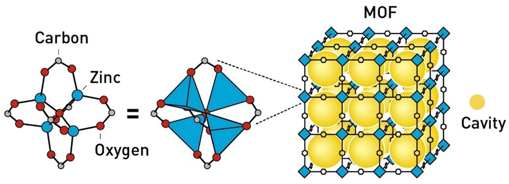 MOFs are crystalline materials built from metal ions (or clusters) and organic linkers that assemble into highly ordered, porous architectures. Often described as “molecular buildings,” they contain vast internal cavities through which guest molecules can flow in and out. This unprecedented “inner space” endows MOFs with exceptional capacity for storage, separation, and catalysis.