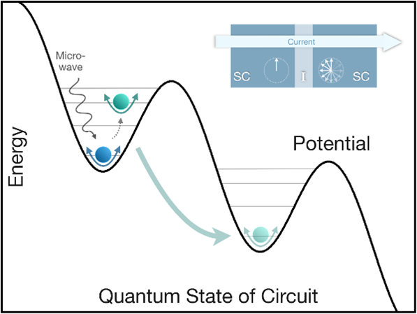 The potential energy landscape of a current-biased Josephson junction (top right) forms a tilted washboard, where the superconductor/insulator/superconductor (SC/I/SC) circuit’s quantum state behaves like a ball in a potential well. The phase difference between the two superconducting electrodes (shown as a clock-like phasor) changes by 2π with each tunnelling event. Two macroscopic quantum effects appear: direct quantum tunnelling between wells (green arrow) and microwave-assisted tunnelling via discrete excited states (grey arrows), revealing quantised energy levels.