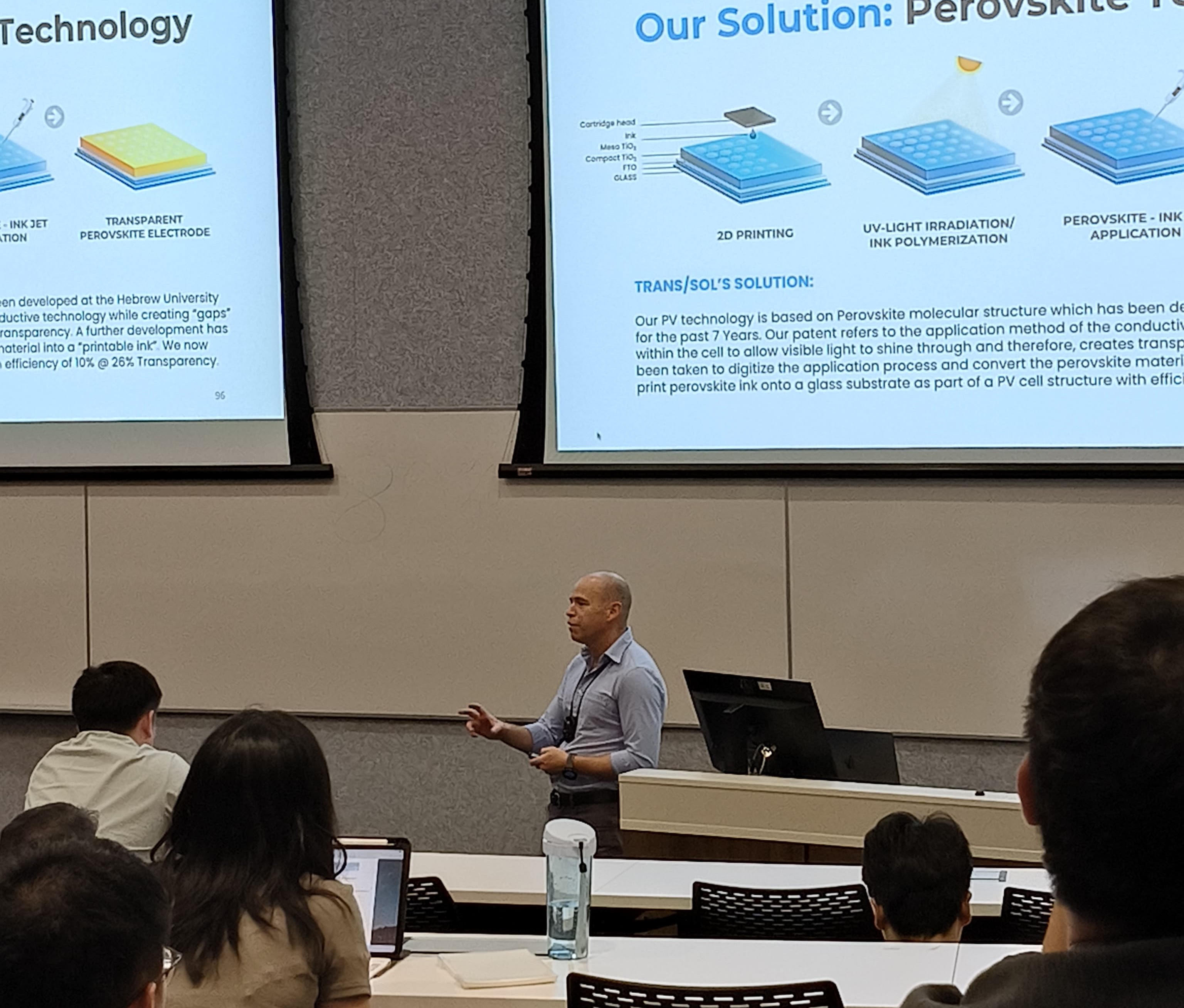 He concluded with a summary of the perovskite photovoltaic (PV) technology developed at The Hebrew University over the past seven years. The team's patented method involves creating ‘gaps’ in the conductive layers to allow visible light transmission, producing transparent solar cells. Furthermore, the perovskite material has been converted into printable ink, enabling direct printing onto glass substrates. Their PV cells now achieve an efficiency of 10% at 26% transparency, marking a significant advancement toward commercially viable transparent solar technology.