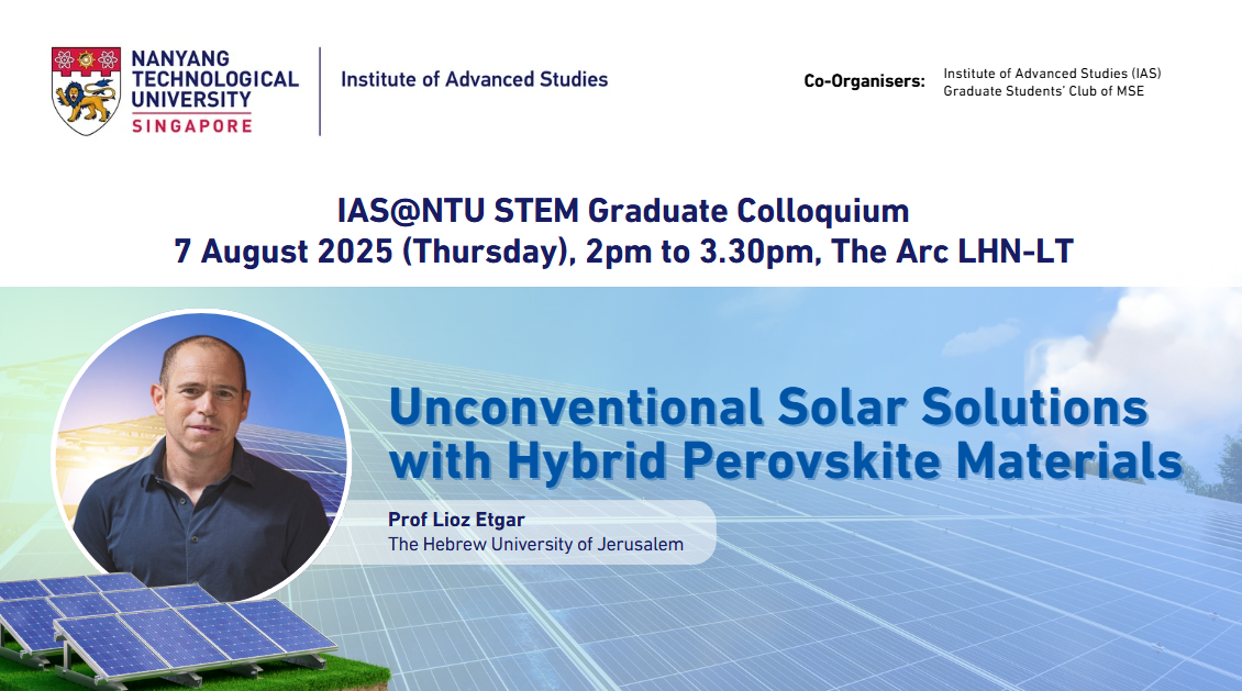 On 7 August 2025, the Institute of Advanced Studies (IAS) at Nanyang Technological University, in collaboration with the Graduate Students' Clubs of MSE, recently hosted an insightful colloquium "Unconventional Solar Solutions with Hybrid Perovskite Materials" by Prof Lioz Etgar from the Hebrew University in Jerusalem.