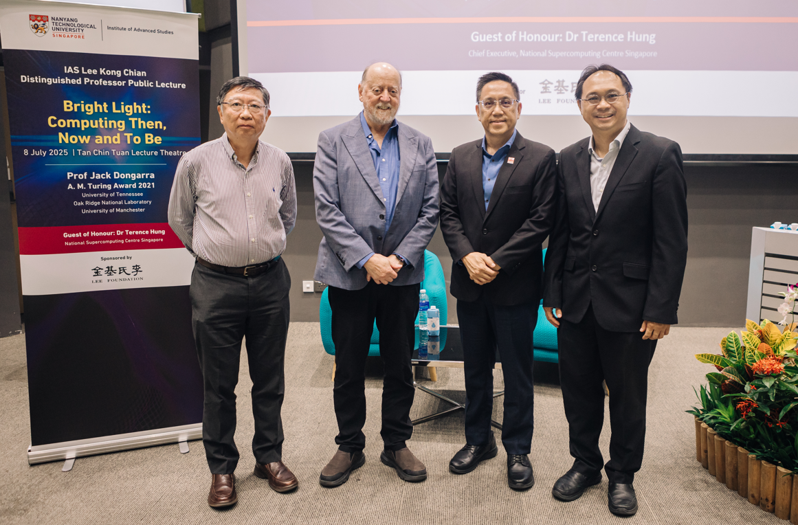 Prof Jack Dongarra, the 2021 ACM A.M. Turing Award laureate and distinguished authority in high-performance computing, was appointed as a Lee Kong Chian Distinguished Professor in conjunction with his public lecture delivered on 8 July 2025. Sponsored by the Lee Foundation, the lecture was hosted by NTU’s Institute of Advanced Studies (IAS) in the Tan Chin Tuan Lecture Theatre.
