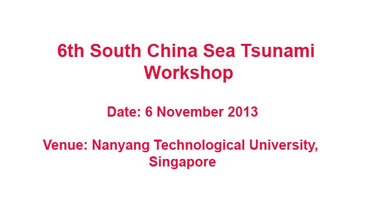 The past five South China Sea Tsunami Workshops (SCSTWs) were held in Taipei, Taiwan (2007), Shanghai, China (2008), Penang, Malaysia (2009), Banda Aceh, Indonesia (2011), and Beijing, China (2012). Following the success of past SCSTWs, the 6th South China Sea Tsunami Workshop (SCSTW6) will be held in Singapore from 6th to 8th November 2013, in collaboration with the Institute of Catastrophe Risk Management (ICRM), Nanyang Technological University (NTU), Singapore, and Cornell University, USA.