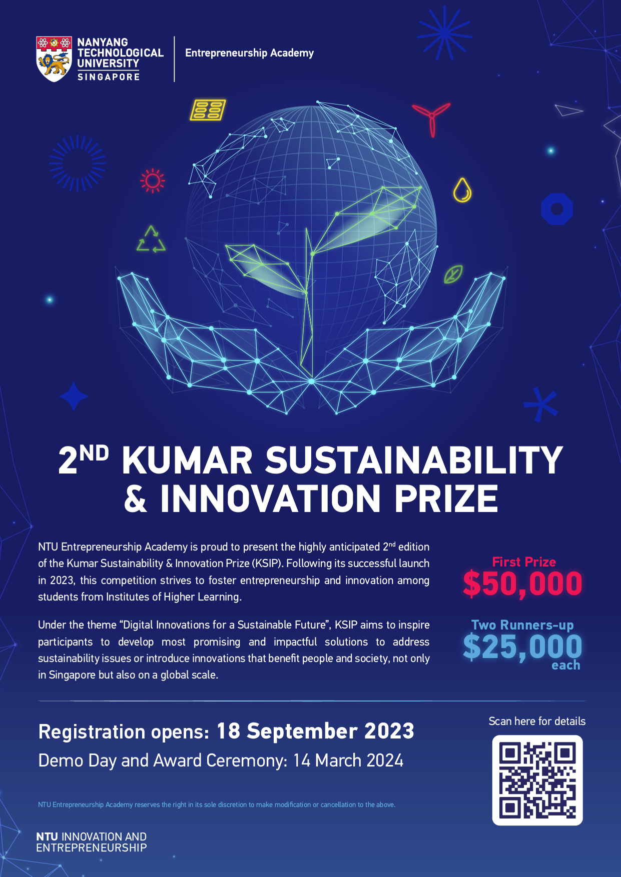 The Kumar Sustainability & Innovation Prize aims to promote entrepreneurship and innovation within the NTU community to develop the most promising and impactful solutions to address sustainability issues or innovations benefitting people and society, in Singapore and beyond.