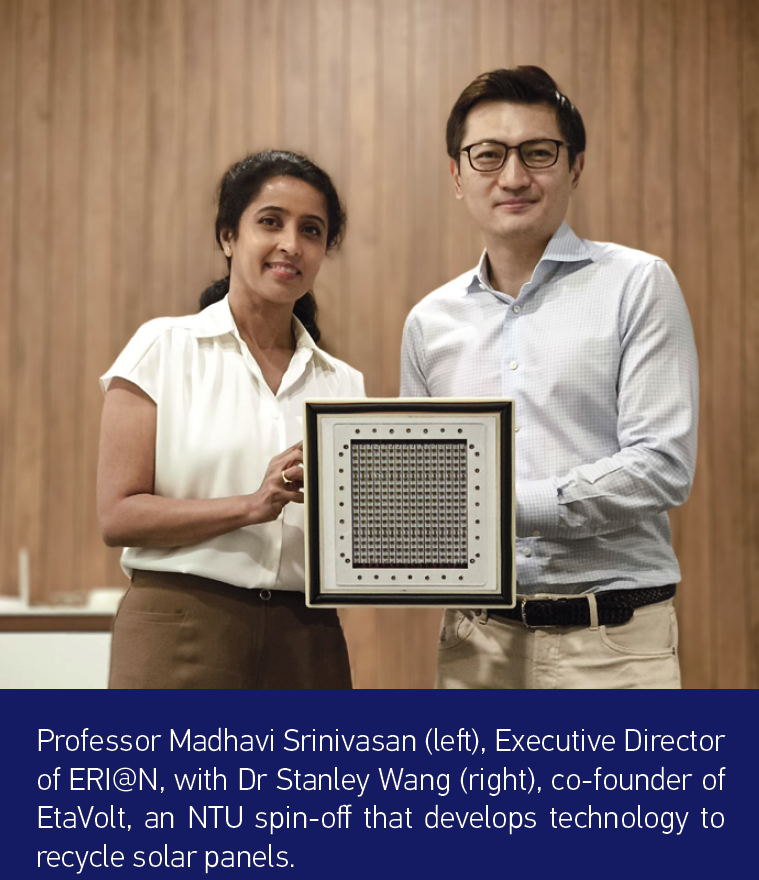 Focusing on solar-panel recycling, NTU spin-off EtaVolt’s path similarly reflects a convergence of disciplines, from materials science and electrical engineering to power electronics and energy systems integration. This interdisciplinary environment helped the team focus various facets, whether component optimisation, or system-level performance attributes such as efficiency, reliability and manufacturability that determine whether a technology can be deployed. External partnerships helped validate use cases, clarify deployment constraints and surface regulatory expectations earlier. Alongside this, NTU I&E complemented technical progress with venture development support, connecting the team to mentors, networks, pilot opportunities and funding to turn technical strength into commercial readiness.