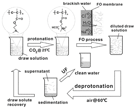 The present technology introduces a draw solute specifically designed for forward osmosis, integrating carbon dioxide and responsive structural units. This composition enables the solute to respond efficiently to changes in environmental conditions, switching between a protonated state and a deprotonated state as needed. This feature makes the draw solute highly effective and reusable within the forward osmosis membrane process.