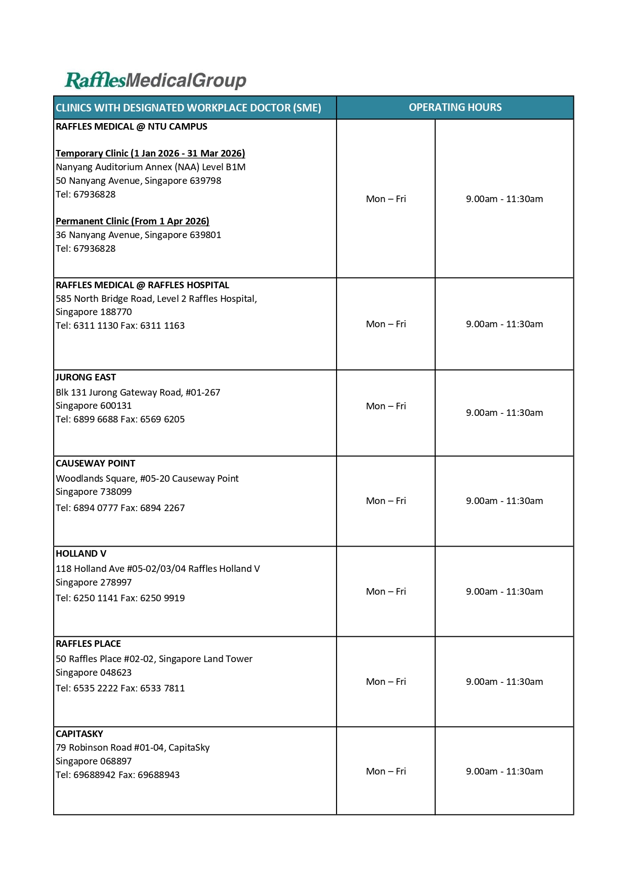 • Service Provider: Raffles Medical Group, new campus clinic operator