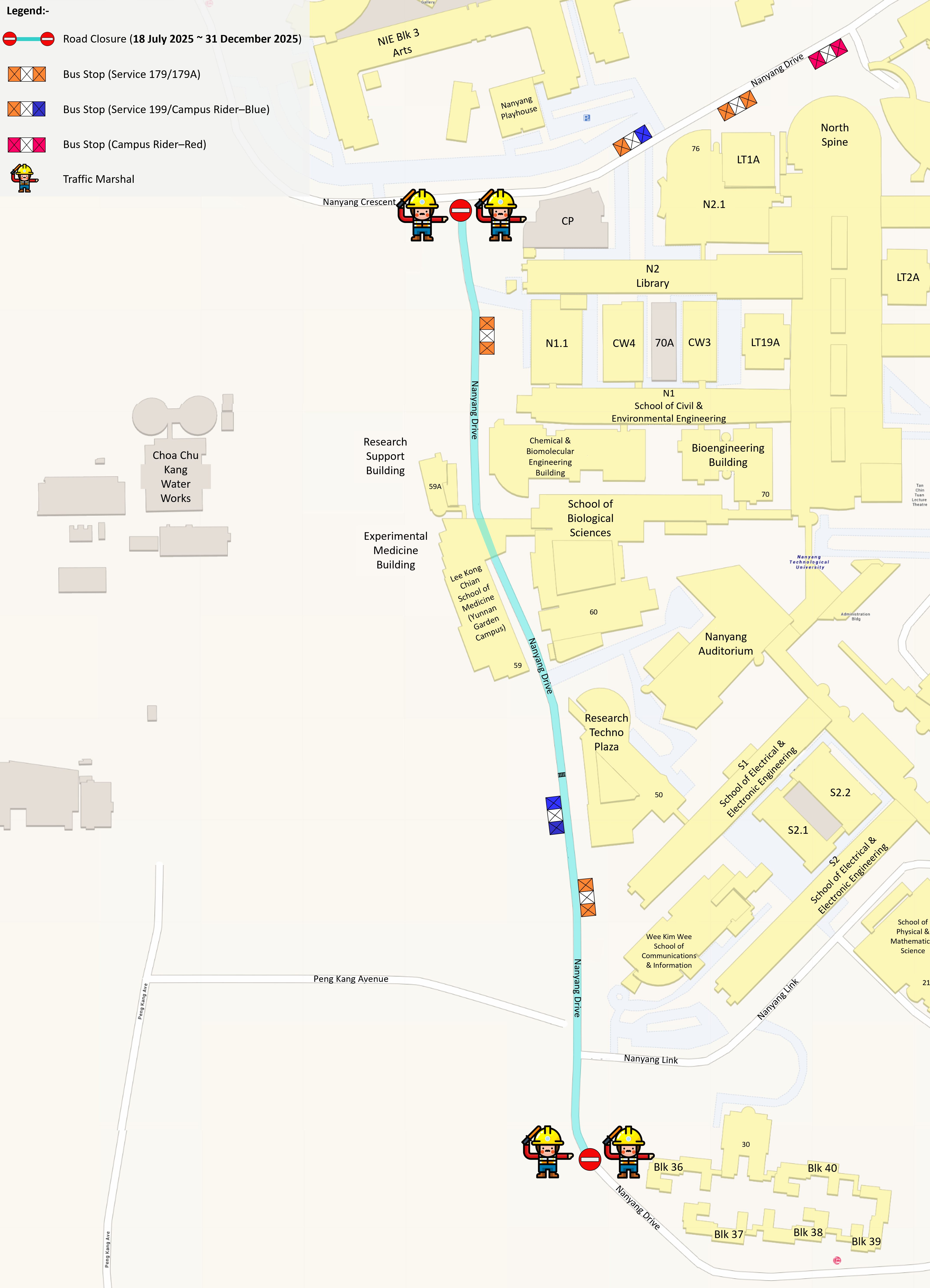 - Motorists travelling along Nanyang Drive and Nanyang Avenue are advised to slow down near construction sites, and follow the instructions of traffic marshals on site. Road lanes may be temporarily affected to facilitate the delivery of equipment.