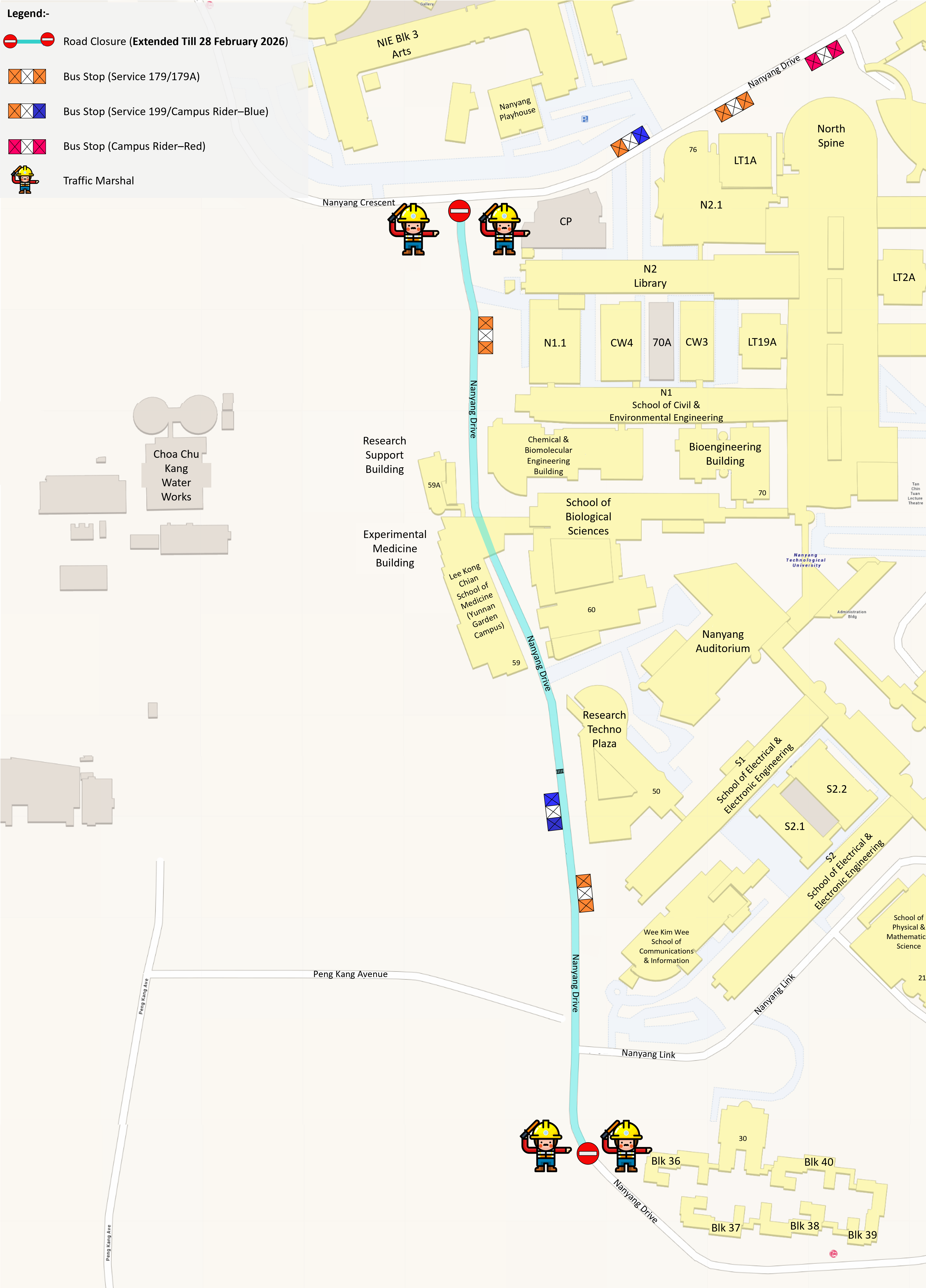 There is a traffic diversion on Nanyang Drive in front of North Spine (near Lee Wee Nam Library and NIE). Look out for pedestrians crossing the affected route and follow the traffic signs.