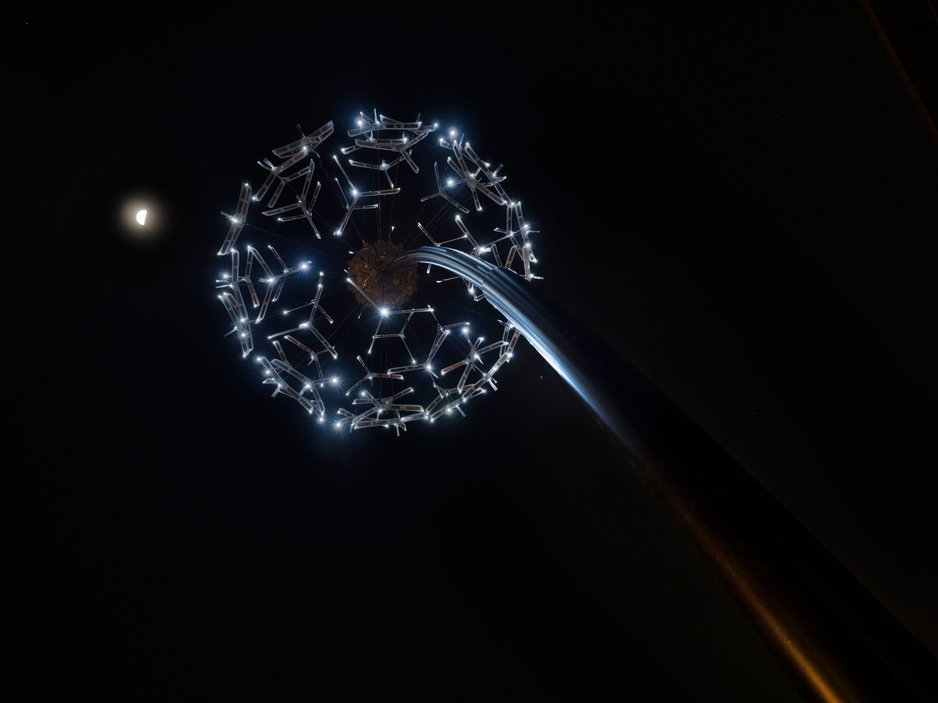 Dandelion is conceived to mimic the dandelion flower’s natural structure known as Taraxacum. It is composed of 59 'seeds', each one a sealed and self-sustaining power generating unit, secured onto a Pentakis-Dodecahedron structure that holds them on top of the stem. The seeds are interchangeable and the failure of one will not affect the entire system. The light installation harvests solar energy in the day via 12 solar panels and stores enough charge to last three days of cloudy skies.