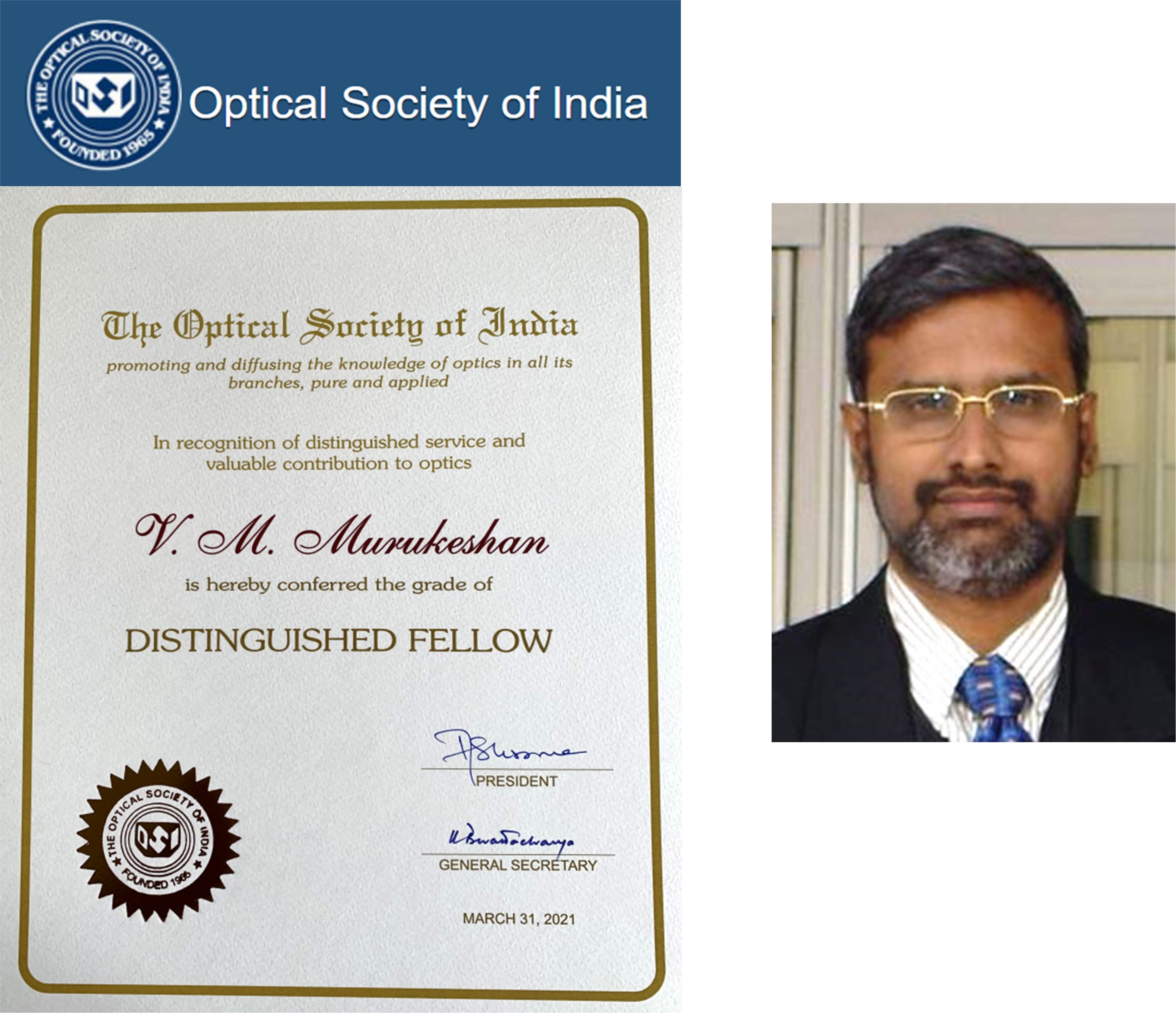 The Optical Society of India (OSI) has awarded Prof. Murukeshan the distinguished fellowship of OSI in 2021 for his outstanding contributions to Optics research. He joins a distinguished list of 23 previous recipients. This is the highest honour awarded by OSI to optics researchers.