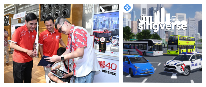 黄永杰(右)展示他的公司所开发的游戏 “Singverse”,玩家可以在游戏中探索数位版本的新加坡,并学习公共安全知识。
