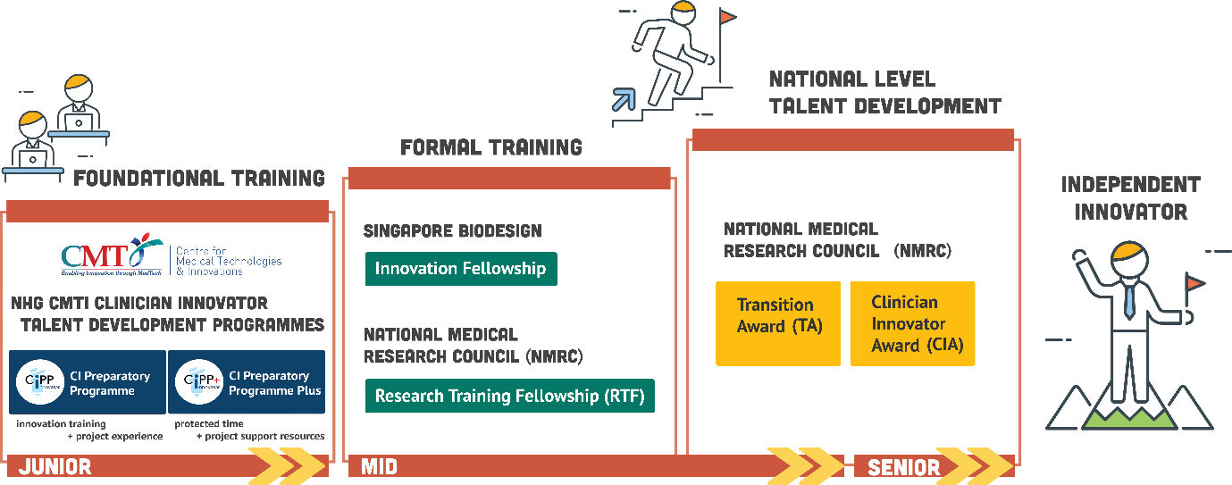 The CI Development programmes empower aspiring CIs with relevant knowledge and skills tailored to their learning needs and varying experience in this field. The programmes are overseen by the NHG Centre for Medical Technologies and Innovations (CMTi) and administered by the Clinician Scientist Development Office (CSDO).