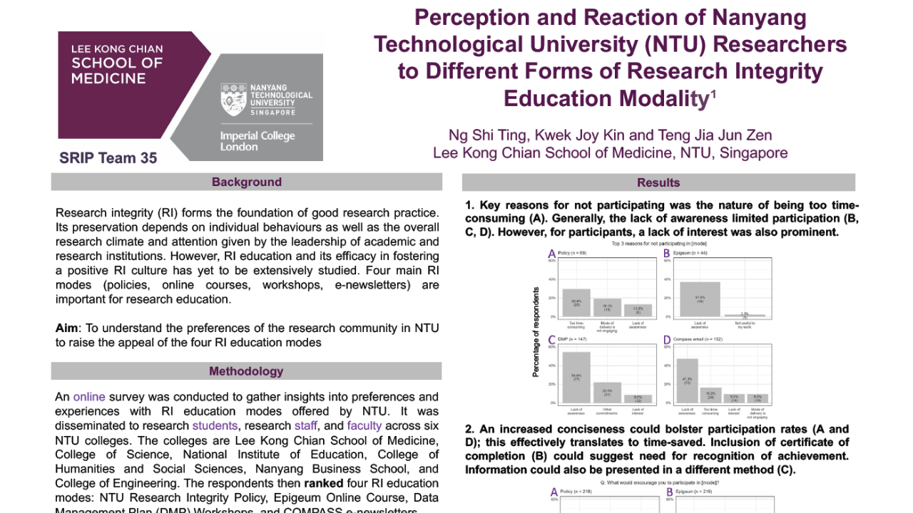 Considering the positive feedback and the effectiveness of SRIP in providing students with a meaningful introduction to research by engaging with LKCMedicine faculty, SRIP is now incorporated into the Scientific Enquiry and Evidence-Based Medicine (SEEM) module in Year 3 as a precursor to the Scholarly Project in Year 4.