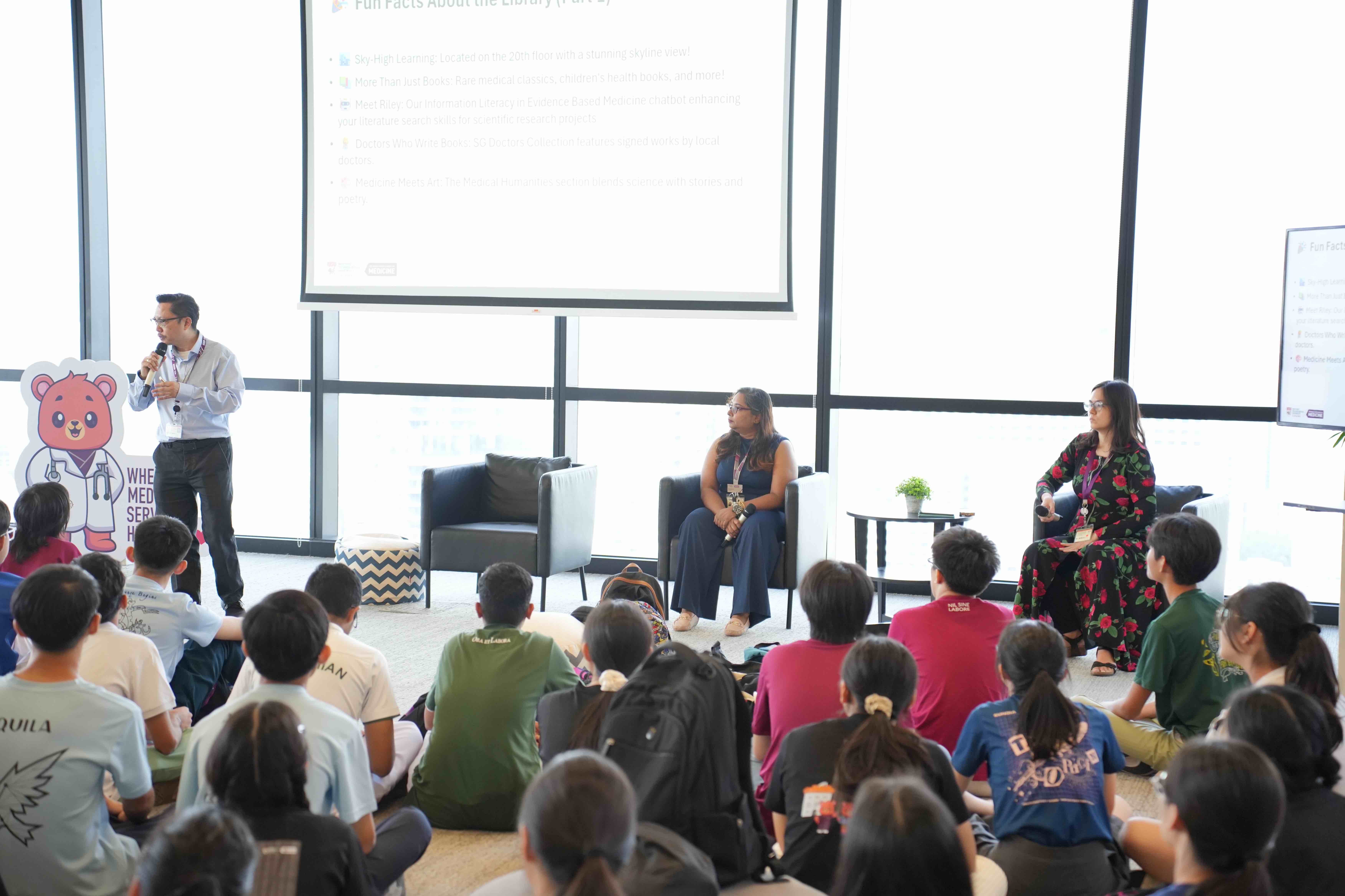 Over at the Sim Hoay Cheok – Sim Foundation Library, a new library engagement session led by LKCMedicine’s very own expert librarians gave campers the chance to witness how the medical library empowers our medical students with AI tools like Riley, the Information Literacy in Evidence-Based Medicine (IL-EBM) chatbot, integrated into their Scientific Enquiry and Evidence-Based Medicine (SEEM) curriculum. Campers were tested on their newly attained knowledge through a quiz, with specially prepared prizes presented to the top 10 scorers.
