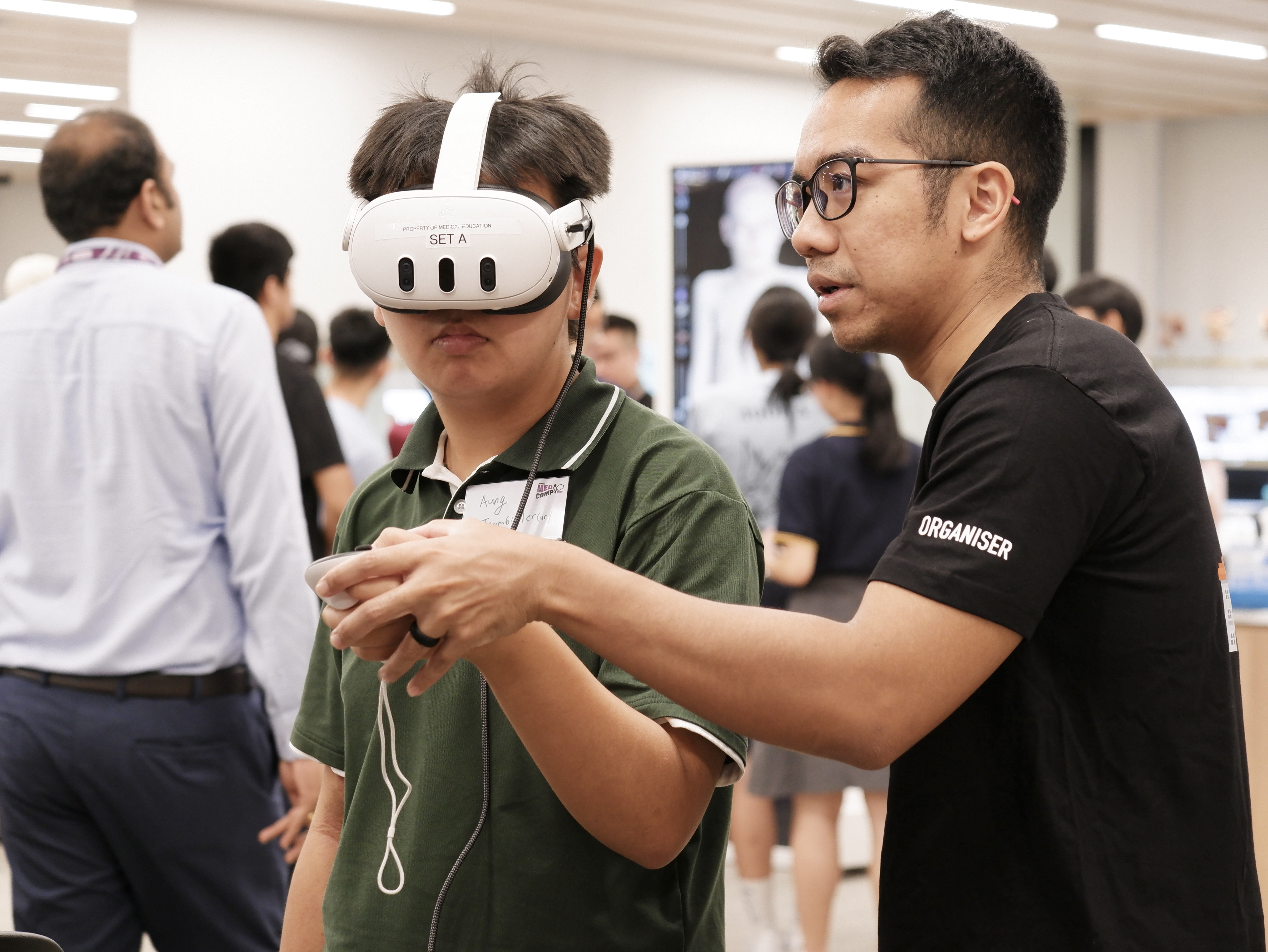 Following a talk led by Assistant Professor Bernett Lee, Director of the Centre for Biomedical Informatics, campers had the chance to practise clinical communication with an AI-powered clinical chatbot, prescribe medication using a digital ePrescription tool, and challenge their knowledge and reflexes through VR activities conducted by the Digital Learning team. They also experimented with voice cloning and designed their own digital twin!