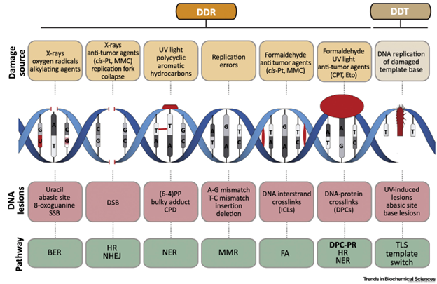 Figure: DNA Repair Pathways. Schematic model of various DNA lesions caused by different genotoxic agents and respective DNA repair pathways. Specialised DNA repair pathways that cope with specific types of DNA lesions are essential for genome stability but also represent a promising therapeutic window for cancer therapy. The role of DNA repair pathways is involved in all three aspects of our research themes. (Adopted from Vaz et al. TIBS, 2017)