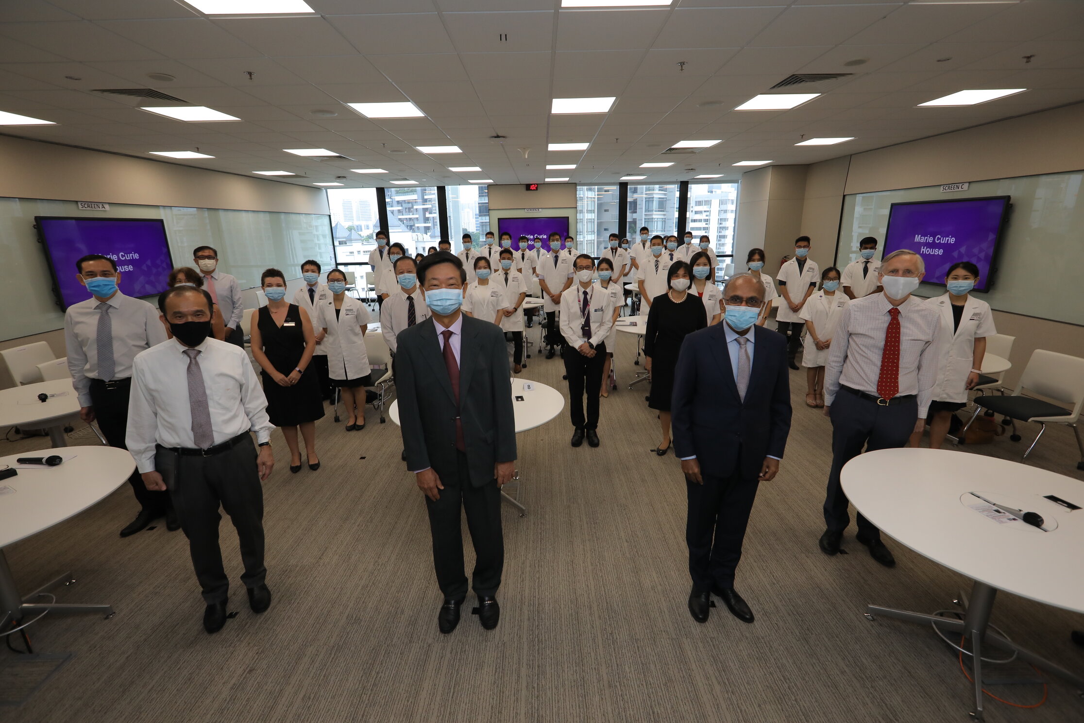 LKCMedicine Dean Professor James Best then announced the conferring of the white coat and meaning behind this symbolic gesture. The GOH Entourage – comprising Prof Chee, Mr Lim, Prof Subra, NHG Deputy Group CEO (Education & Research) and Group Chief Research Officer Dr Benjamin Seet, Prof Best, LKCMedicine Vice-Deans and Chief Operating Officer – proceeded to each of the five House venues to witness the students' donning of White Coats.