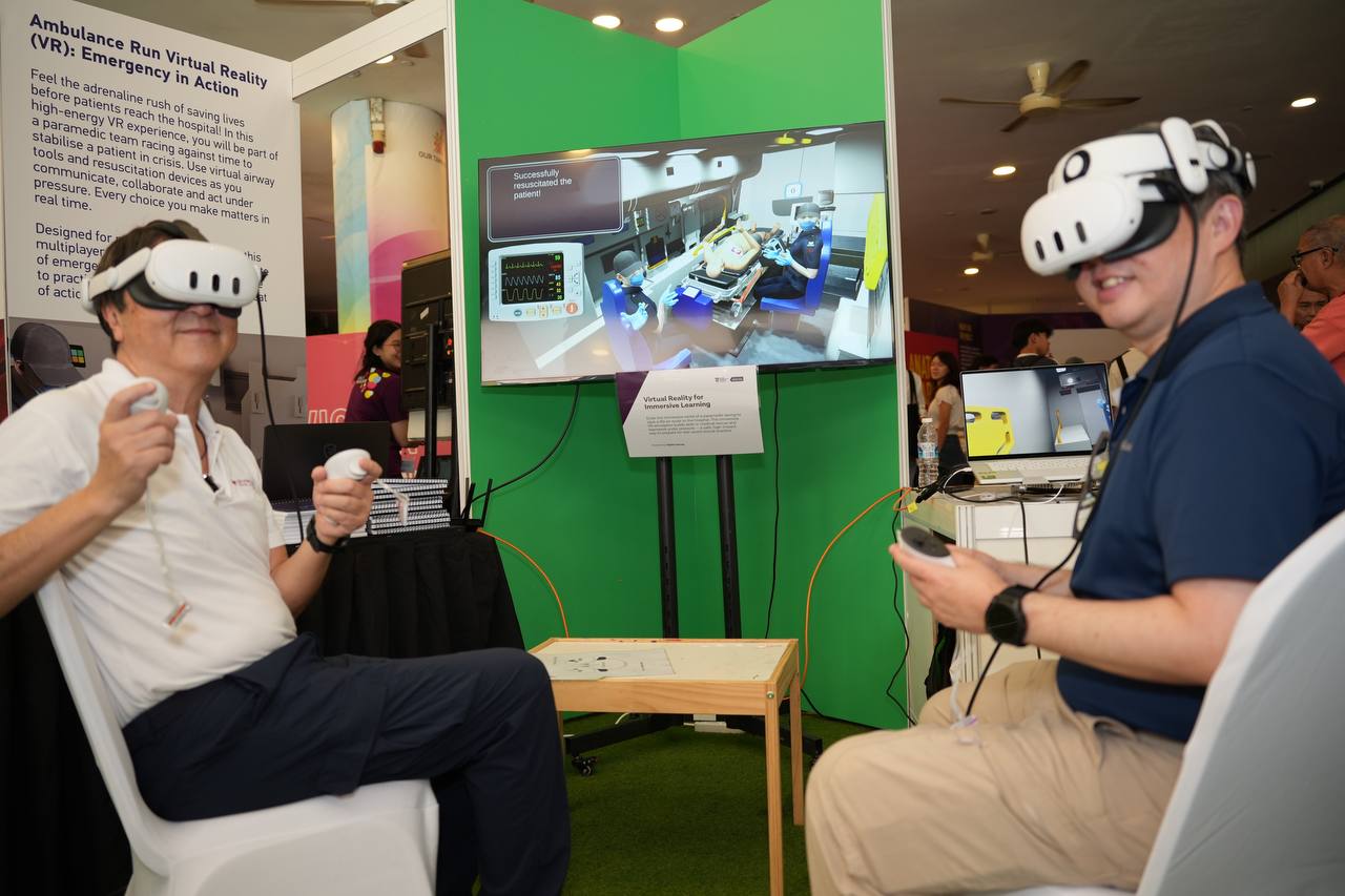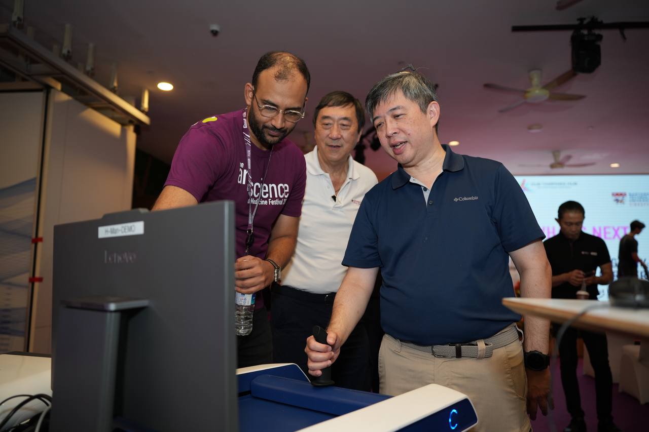 During the tour of the Festival, Prof Mak visited various booths alongside LKCMedicine and NHG Health leaders. He engaged with researchers at booths on AI in Medicine and rehabilitation medicine. Prof Mak also tried his hand at the School’s VR medical education tool and observed our alumni at the ultrasound station.
