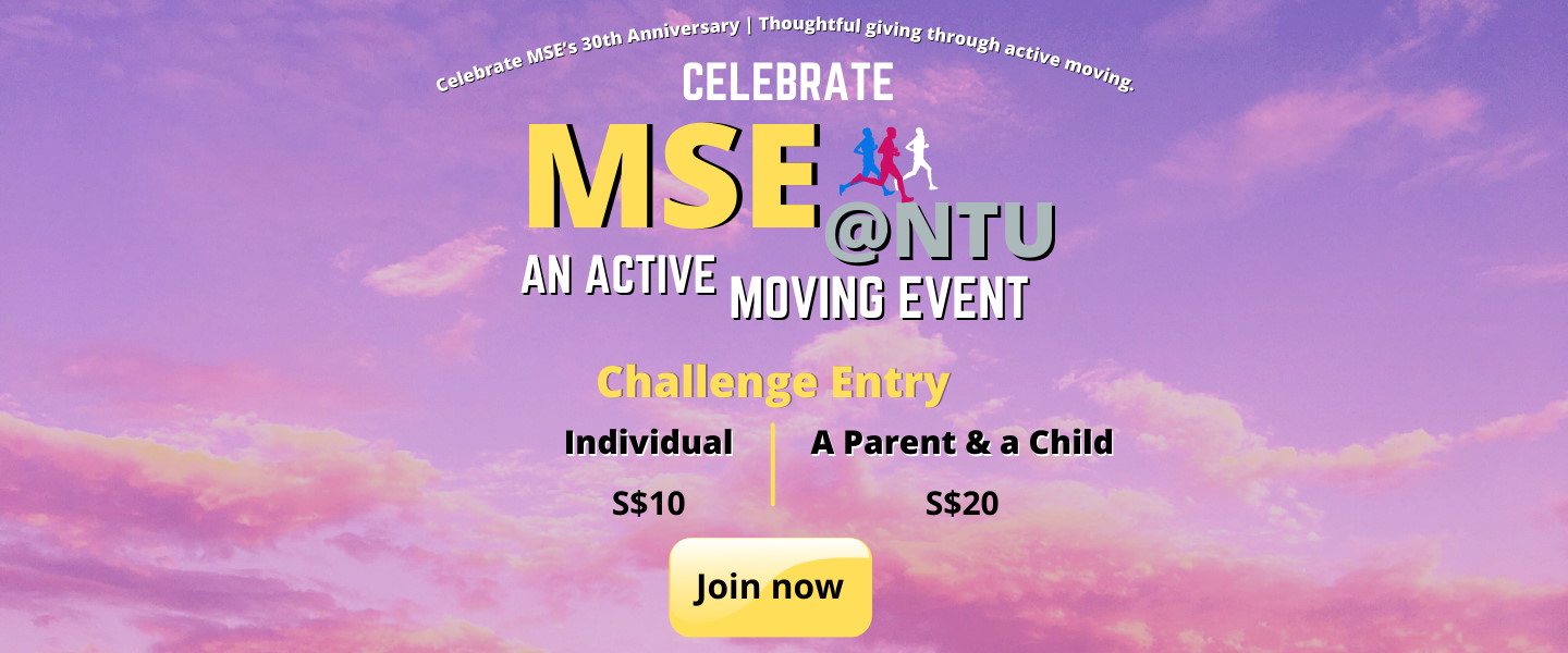 School of Materials Science and Engineering (MSE) of Nanyang Technological University is celebrating its 30th anniversary in 2021. The motive of this active moving event that includes distance running and walking challenges is to bring together the entire MSE community of students, alumni, faculty and staff, collaborators, as well as family and friends for a good cause and in commemorating this milestone.