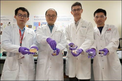 | From left: Dr Pan Xiaoyong, Prof Hu Xiao, Prof Ng Kee Woei and Dr Zhao Zhitong holding up various raw materials such as human hair and keratin solution and their keratin-based hydroponics substrate. (Source: NTU) | Hydroponics substrates made of keratin and cellulose fibres could be a growth medium used in urban farming. (Source: NTU)