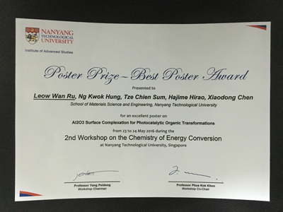 We would like to extend our warmest congratulations to Ms Leow Wan Ru, who is a PhD student of A/P Chen Xiaodong, for winning the Best Poster Award at the 2nd Workshop on the Chemistry of Energy Conversion. This workshop is organized by the Institute of Advanced Studies from 23 – 24 May 2016 at NTU. Wan Ru’s poster is entitled, “Al2O3 Surface Complexation for Photocatalytic Organic Transformations”.