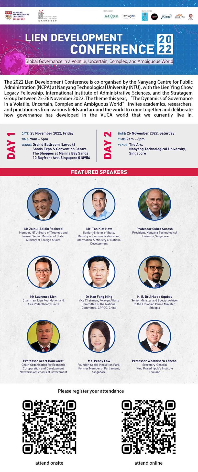 The 2022 Lien Development Conference is co-organised by the Nanyang Centre for Public Administration (NCPA) at Nanyang Technological University (NTU), with the Lien Ying Chow Legacy Fellowship, International Institute of Administrative Sciences, and the Stratagem Group between 25-26 November 2022. The theme this year,