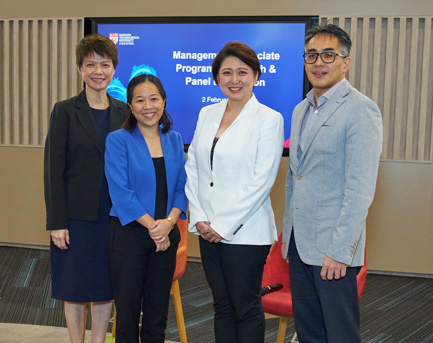 Image: A panel discussion was held in conjunction with the launch of the NTU Management Associate Programme to discuss the role of universities in shaping the future of work. The discussion was moderated by Ms Ong Seok Bin, NTU Chief Human Resource Officer (first from left). On the panel were Ministry of Education’s Deputy Secretary (Higher Education and Skills) Ms Melissa Khoo (second from left); NTU Senior Vice President (Administration) Ms Tan Aik Na (third from left), and Partner at Egon Zehnder Mr Julian Ho.