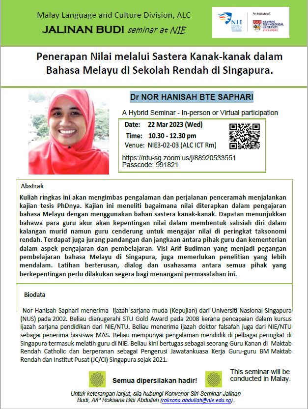 "Our Talk" Series Dr Muhammad Ariff Ahmad Professorship in Malay Studies Play video Retorik, Politik, dan Identiti: Kehebatan Bahasa Melayu dalam Wacana Awam Play video Melestarikan Warisan, Membina Masa Depan: Menelusuri Peranan Pengajian Melayu sebagai Jambatan Komuniti melalui Lensa Pemikiran MAS Syarahan Perdana MAS Play video Berterusannya Hayat Bahasa Melayu Play video Muhammad Ariff Ahmad Permata Cendekia di Tanah Pura 2nd Malay Manuscripts Seminar 2024 Play video Konsep Budi dalam Manuskrip Melayu Play video Aspek Budi dalam Manuskrip Hukum Kanun Pahang Play video Wanita yang Berbudi: Konsep ‘Budi’ dalam Karya Wanita Pulau Penyengat pada Awal Abad ke-20 Play video Antiutopia dalam Hikayat Abdullah Play video Antara Hodoh dan Cantik: Pemikiran Budi dari Hikayat Raja Babi Play video Hikayat Bayan Budiman: Analisis Unsur Penokohan dan Konsep Moral Islam Play video Akal Sebagai Teras Budi, Budi Sebagai Teras Insan: Perihal Budi Dalam Taj Al-Salatin, Sharab al- `Ashikin dan Kitab Pengetahuan Bahasa Play video Nilai-nilai Budi Pekerti dalam Hikayat Pelanduk Jenaka (yang kedua tersalin daripada naskhah lain) Play video Laut Budi Tepian Akal: Standard Kerupawanan dalam Teks Melayu Klasik Play video Rethinking Budi through Malay Pantun: A Historical Overview Play video Sama bak kundi atas dulang? Tinjauan Budi dalam Manuskrip dan Kilauan Literasi Kritis dalam Pendidikan Chinese Language and Culture Play video 国立教育学院中文系研讨会《展望未来:Z世代教师以新视角谈教育》 Malay Language and Culture Play video Antara Ranting Kemuning dengan Kesusasteraan Melayu Singapura Play video Language Development among Malay Bilingual Children in Malaysia: Implications for Education and Language Intervention Play video Penerapan Nilai melalui Sastera Kanak-kanak dalam Bahasa Melayu di Sekolah Rendah di Singapura Play video Pedagogical Translanguaging in Content-based Language Education: Systematic Lesson Planning with MEC Play video Mitochondrion DNA (mtDNA) Profiling of Nusantara and Cape Malays and Its Relationship with Historical, Cultural and Migration Pattern of the Malay Population Play video Perancangan Penggunaan Korpus Bahasa Melayu di Asia Tenggara Play video Media Sosial dan Masyarakat Melayu Tamil Language and Culture Play video Tamil education in Singapore and the Singapore Tamil teachers’ union Play video Guiding Principles of the Development of Tamil curriculum: The Singapore Experience Play video Tamil Education in Malaysia: Challenges and Remedies Play video Professional Development of Tamil Language Teachers: A Perspective Play video Designing an effective second-language Tamil Curriculum for Tamil Diaspora students Play video Language Ideology in Language Teaching: The Case of Tamil in Three Countries Poster Jalinan Budi 2025 Jalinan Budi 2024 Jalinan Budi 2023 Jalinan Budi 2022 Jalinan Budi 2021 Jalinan Budi 2019 Jalinan Budi 2018 Jalinan Budi 2017 Jalinan Budi 2016 Jalinan Budi 2015 Jalinan Budi 2014 Jalinan Budi 2013 Jalinan Budi 2012 Jalinan Budi 2011 Lunch Time Seminar 2020 Lunch Time Seminar 2019 Lunch Time Seminar 2018 Lunch Time Seminar 2017 Lunch Time Seminar 2016